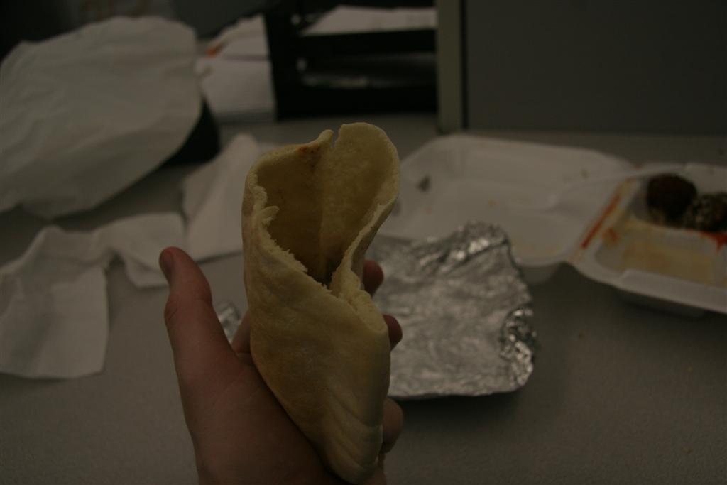 The pita I got at Alan’s seemed bigger and sturdier that the ones I get from Sam’s. I definitely don’t base my falafel-buying decisions on this, but it’s definitely handy if you like to make a sandwich out of your platter.