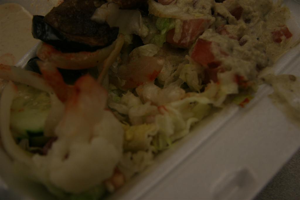 I saved the worst for last, and I’m not just talking about my photography. The salad that came on my platter was really a pitiful affair with yellow lettuce, raw white onion, and unripe tomatoes. Blech. I got more salad at Alan’s than I do at Sam’s, but I had no interest in eating it. In fairness, I think Sam’s falafel may give you so little that I just never noticed how bad it was, so there’s no real loss here. And besides, I may also have just gotten a particularly undelicious portion. It may be fresher on other days, particularly days that aren’t in winter.