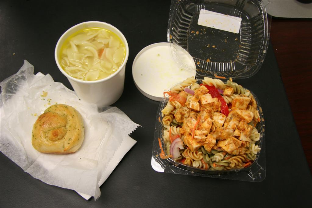 Not normally a selection that I’d get very excited about, but I’m in it for the deal. The day I went there were three soups: chicken noodle, chicken gumbo, and lentil. I grabbed a cajun chicken pasta, a cup of chicken noodle soup, and a garlic knot, and headed for the checkout.