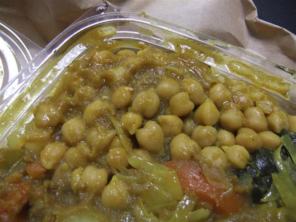 I’m reasonably confident that this is chana masala, and it might have been the best thing in the box. Its chickpeas stewed in a curry sauce pretty similar to the one on the veggies, but better. The best part is that it’s got real peppery heat to it. I never expect anything coming off a buffet line to be actually spicy, as they have to cater to the weak-tongued crowd. But these beans were legitimately spicy. Color me impressed.