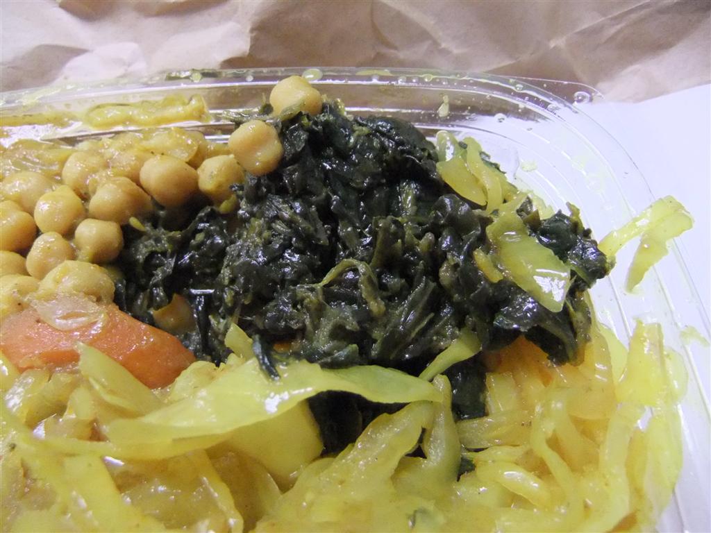 One potential drawback of the combo is that you don’t get any say in what goes into it. Within about 15 seconds of my finishing the word “combo,” the gentleman behind the counter had lined a container with rice and piled on heaping servings of four different dishes. I don’t know if these are the only four vegetarian dishes they serve or if they’re just what come in the combo, but this is what you get. I didn’t ask, but this is pretty clearly a No Substitutions kind of place. Even if you wanted to try, I don’t think you’d have time between ordering and having your order filled.