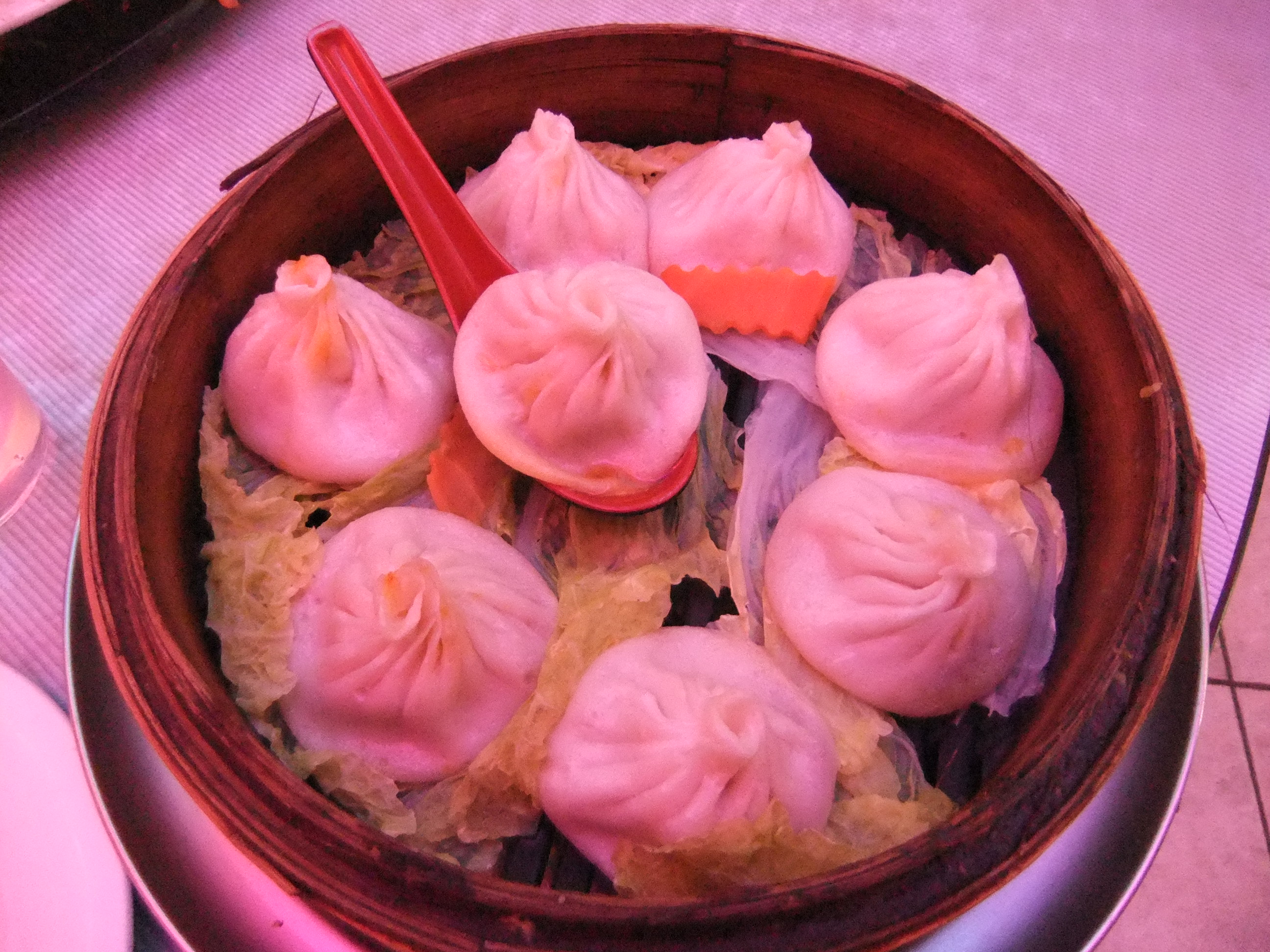 Oftentimes, I find that pork/crab soup dumplings are almost all pork with a tiny bit of crab thrown in as an afterthought. The red glow produced by all the neon lights in the place makes it a little hard to see here, but there was a generous amount of crab mixed into each of my dumplings.