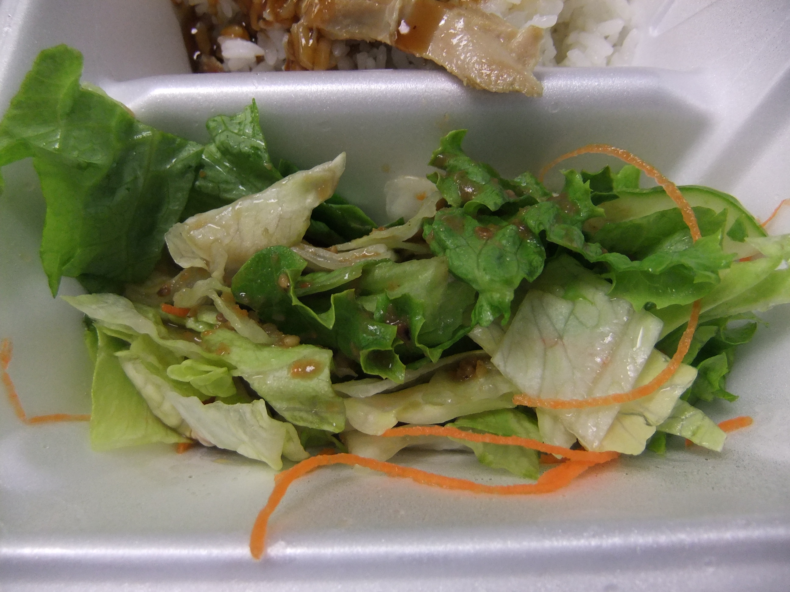 In addition to being nicely segregated from the chicken, the salad is excellent. It’s dressed in a soy-ginger vinaigrette that – like the teriyaki sauce – is both generic and delicious. The salad is nothing to go crazy about on it’s own, but it’s nice to have meat and rice that comes with a salad that’s more than just a total afterthought.