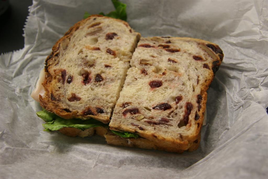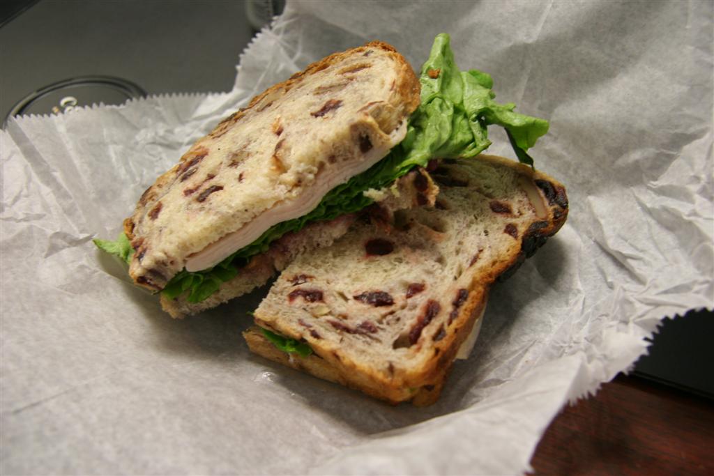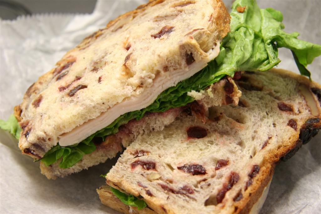 cranberry sandwich – turkey, lettuce, tomato, mayo, relish on raisin pecan (6.50)