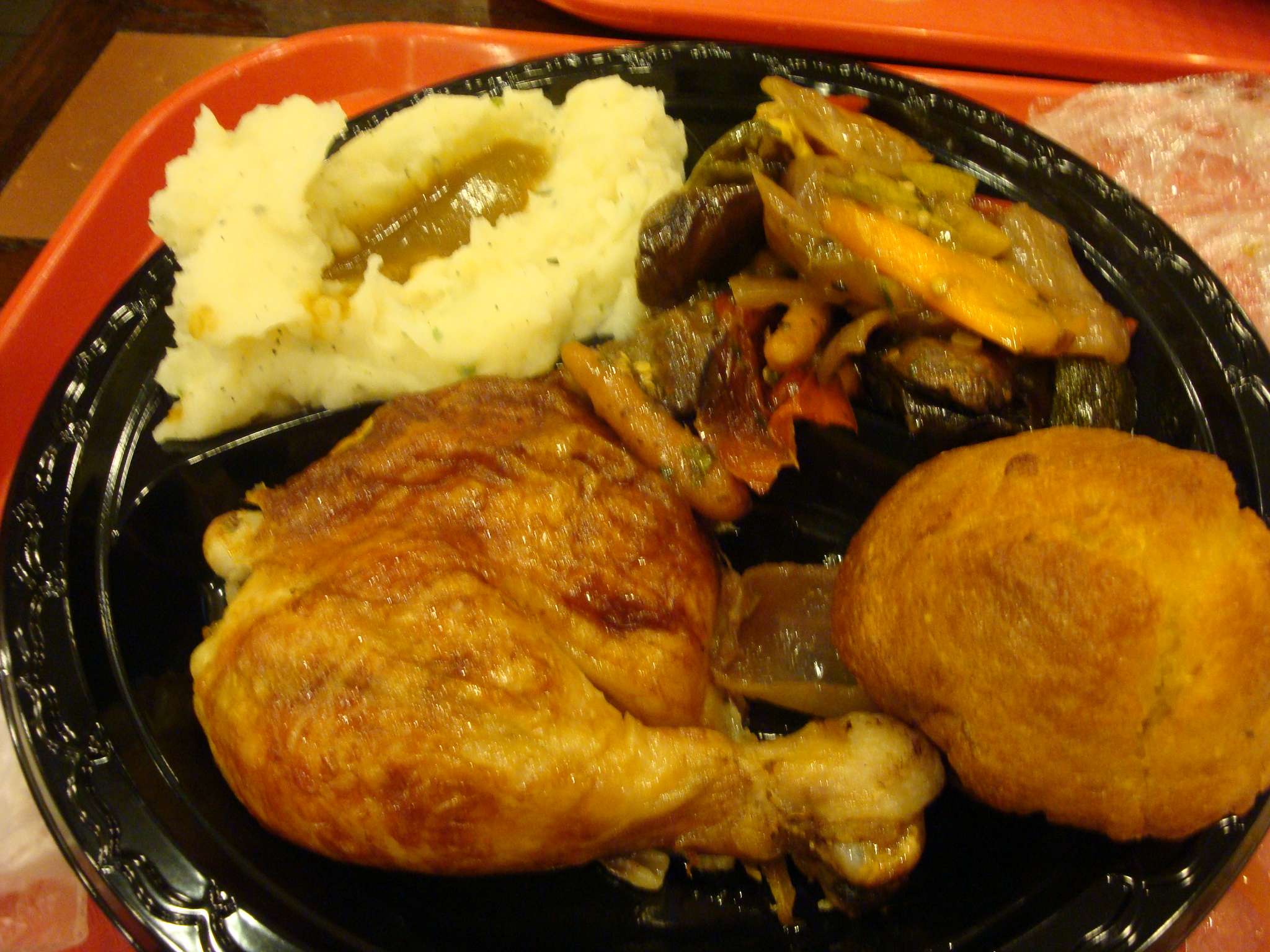 The skin on the chicken was crispy, and the mashed potatoes that I got were real, with actual lumps of potato. For my other side I chose marinated roasted vegetables after an exchange with the guy at the cash register where I asked what he recommended and he responded with “You should probably get a vegetable.” When I said that this was the kind of advice my mom would give me, he went silent, and then grudgingly suggested macaroni and cheese.
