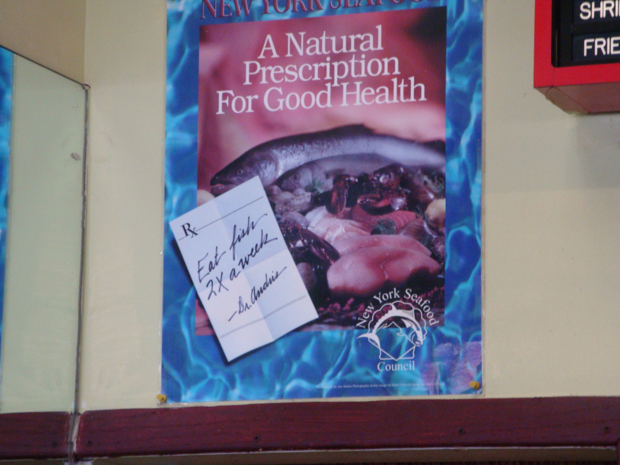 And this awesome poster was hanging next to the signboard touting fried shrimp and fish. I’m pretty sure that the prescription for “Eat fish 2x a week” was not intended for this use.