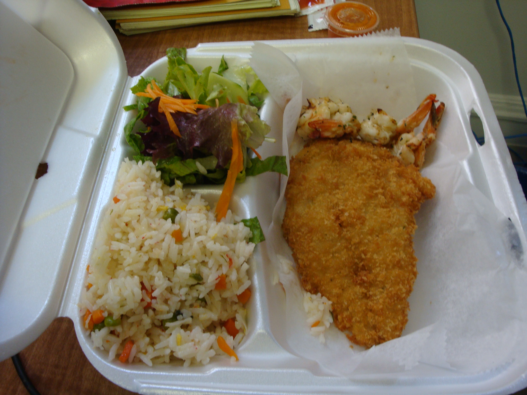 In the interest of trying more than one thing, I went with one of the many “specials” the place has taped up and written on poster board. The combo was fried fish and grilled shrimp that came with seafood rice and salad for $7.99. Entirely fried combos are totally available, but I did not want to feel like death for the rest of the afternoon.
