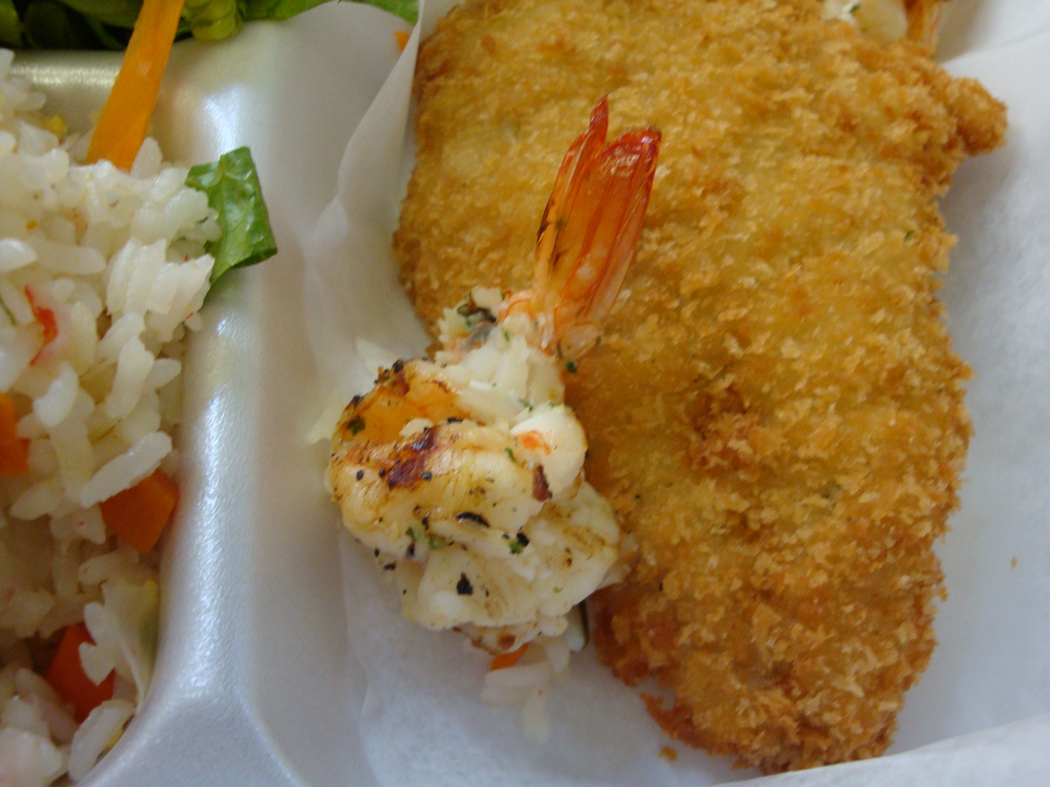 I chose whiting for my fish, and it was a wise decision. It had a panko breading that was actually crispy despite being in a sealed styrofoam container while I walked back to my office. There were only four grilled shrimp, but they were larger than expected and coated in some sort of oil or butter and seasoning. It was like shrimp scampi but with less grease.