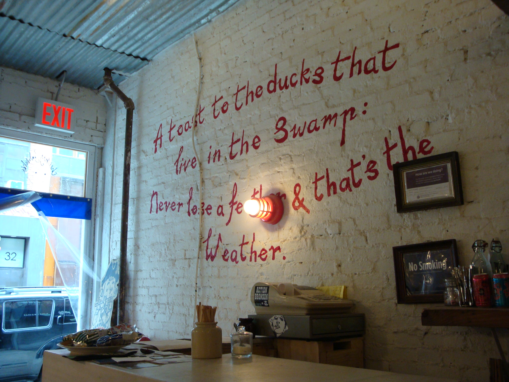The shop itself is bare-bones and a nice change from the chain-like interior of many places downtown. It’s like having lunch in a shack down by the bayou, which was probably by some carefully crafted design.
