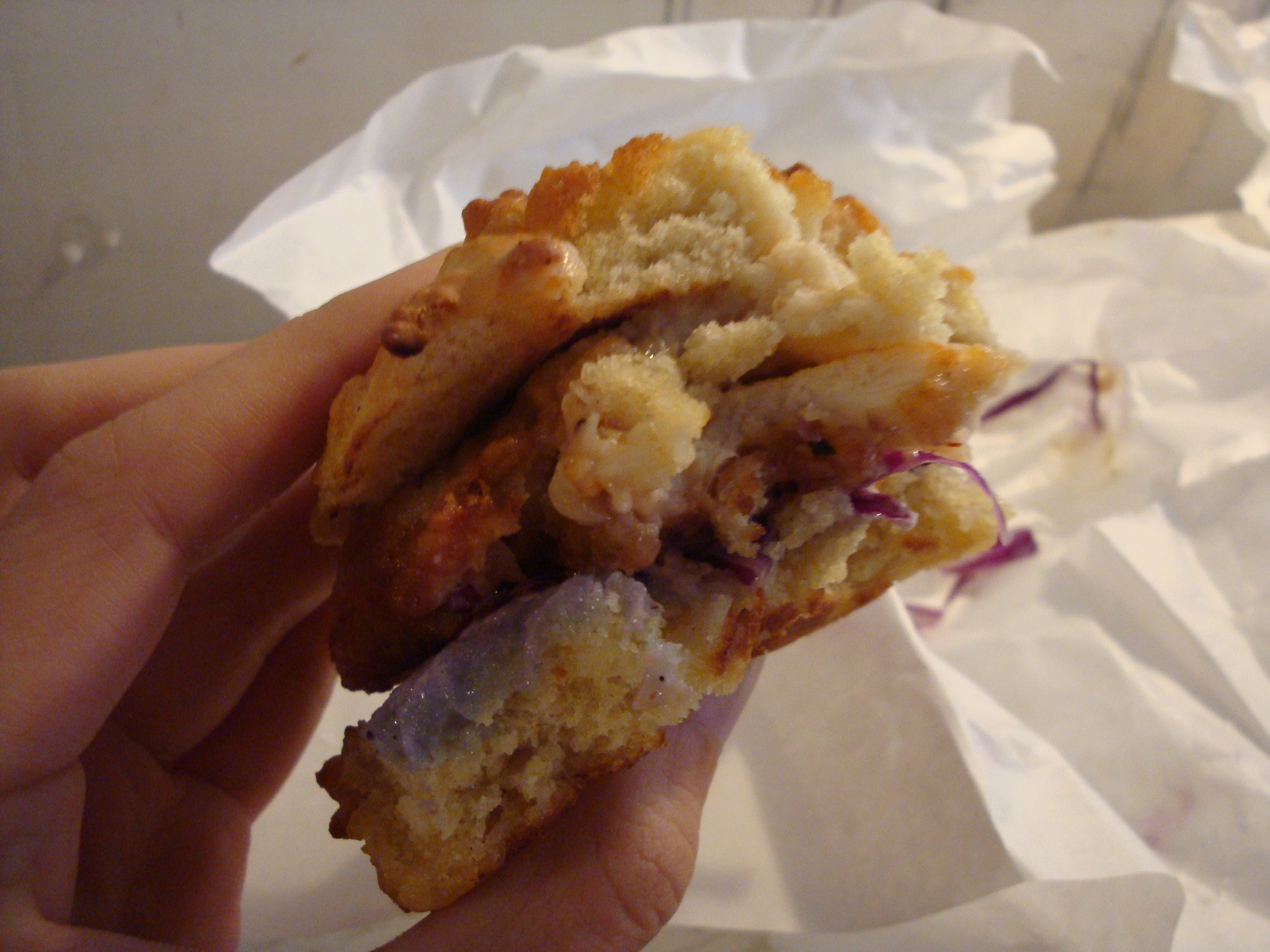 As you can see, the sandwich and my dainty, ladylike hand are about the same size. After eating it I discovered why the sandwich wasn’t any larger because that is one small gut bomb. Fried chicken, cream gravy, coleslaw and biscuit together probably pack three days worth of fat intake, but it was delicious.