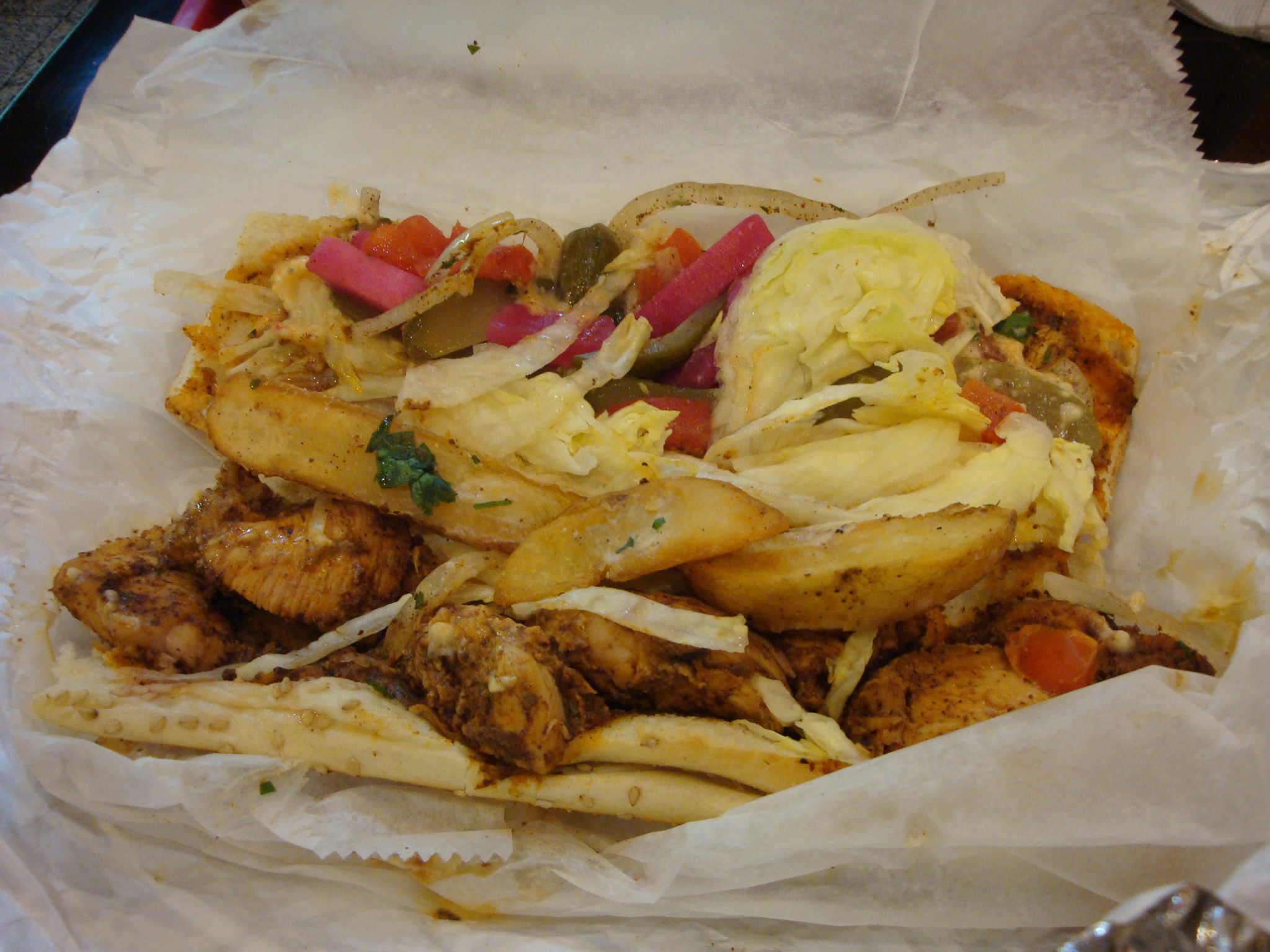 I was somewhat skeptical of having a baguette sandwich at a Mediterranean place, but went with it. I don’t know what they do to the sandwich, but they toast it in some sort of contraption and it makes the bread really crispy and hold up better to the ingredients. Sadly, the chicken in the sandwich was not off the shawarma turning behind the counter, but was white meat chunks with a bunch of seasoning on the outside. It also contained pickled vegetables, actual pickles, lettuce, onion and a garlic sauce that I would call crack-like.