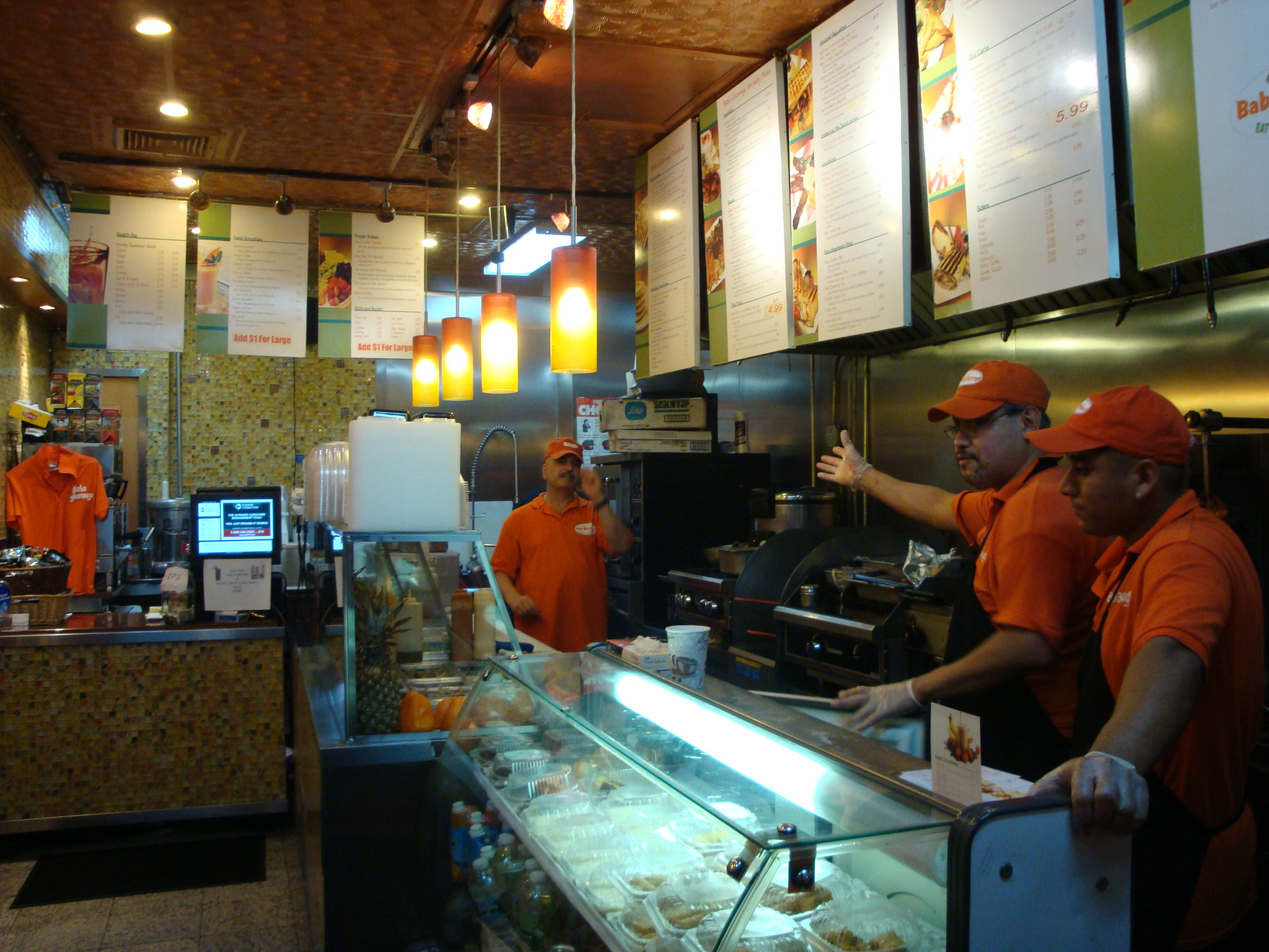 One word of caution is that they don’t automatically ask if you want spicy sauce on your sandwich by default like they do at the street meat carts. It also takes a few minutes to get the sandwich, I’m guessing because of the toasting and carving of meat off of spits. They have some lunch specials like a falafel sandwich with a soda or water for $4.95 or any baguette sandwich with a side for $7.95.