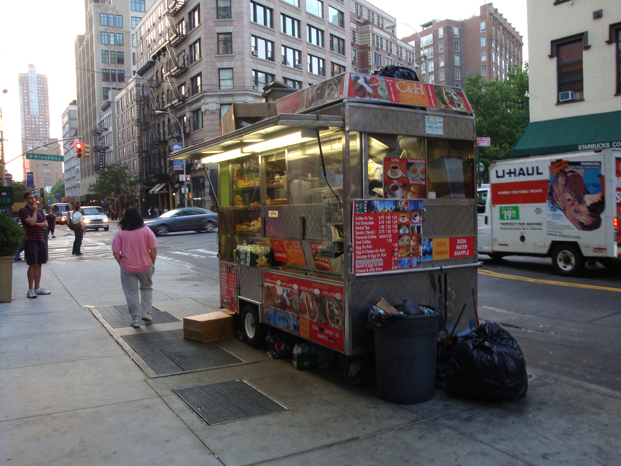 Well, I guess it’s been a while since we’ve had a good old-fashioned cart vs. restaurant battle downtown. I stumbled upon the above (apparently, great minds think alike) on the side of the C&H Halal cart at the corner of Chambers St. and W. Broadway. The cart serving standard street meat parks in front of what is now Plein Sud, a French restaurant in the Smyth Hotel. My first thought was that these places are not exactly in competition with each other for customers. A representative from the restaurant agreed, and said the problems lie mostly in trash from the cart.