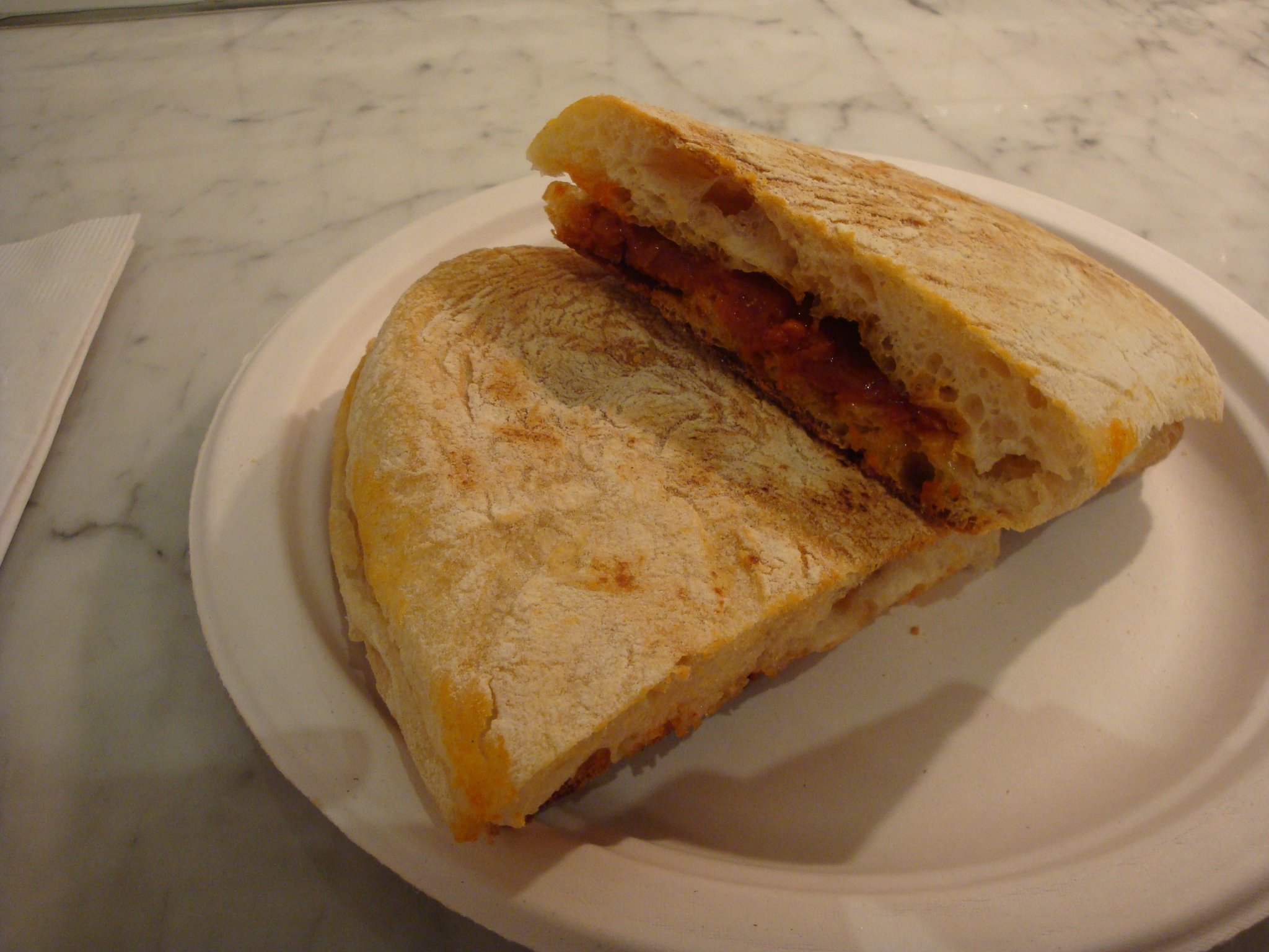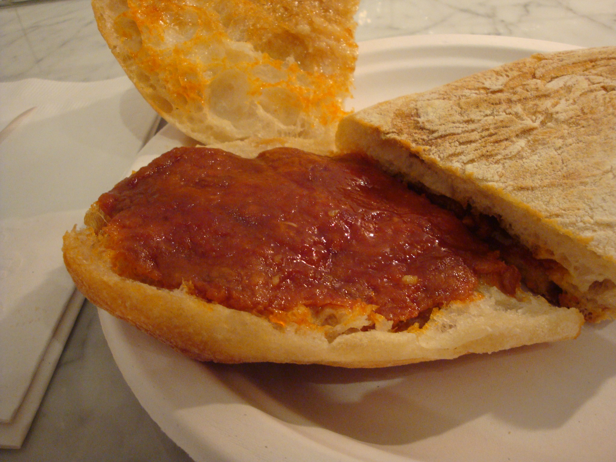 I spotted the Mallorquin ($8.50) and got that mostly because it involved something called chorizo spread, with honey drizzled over it. I can get behind any sort of meat spread. It looked like it was filled with tomato sauce, but nope, it’s pretty much just ground up meat with oil and the honey. Well, it could have used some peppers or something, but it was still really tasty…and greasy. If you get this sandwich, or probably anything involving chorizo, be warned that it will drip bright orange grease on you at some point. Thankfully they supply you with absorbent napkins.