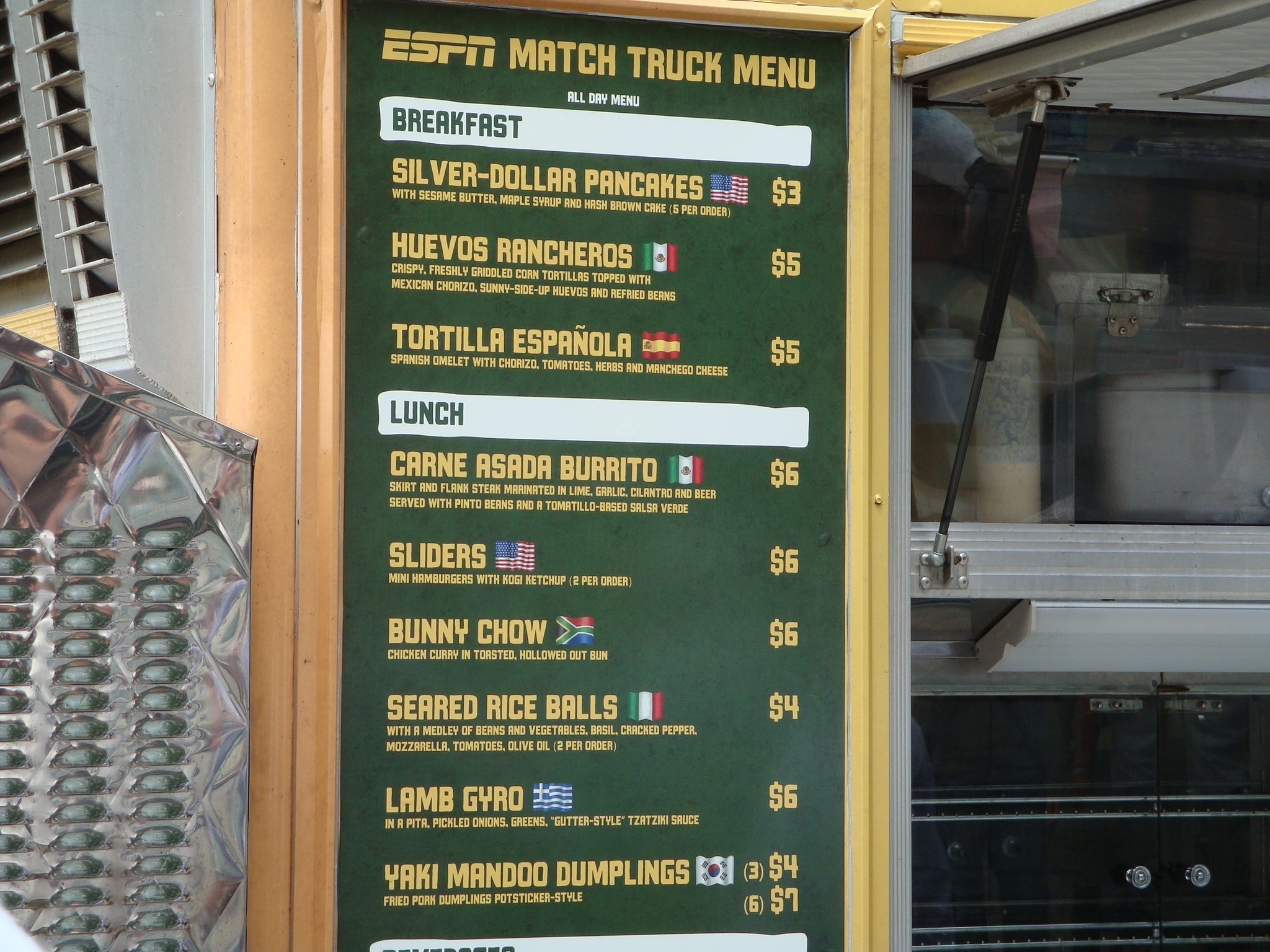 After a tip from a lunch’er alerted me that the ESPN Match Truck that was both broadcasting sports matches and serving international food was parked at Bowling Green, my stomach and I had to investigate. You can find out the daily location of the truck here, or follow it on Twitter, but it looks like it will be at Bowling Green (at Broadway) again on Thursday and then next Tuesday. Anyway, all you have to do is follow the sound of the vuvuzela (it sounds like a ferry blowing its fog horn…five feet away from your face) and the ESPN sports commentators coming from the TV screen on the top of the truck. What kind of tasty fare can a truck from a sports channel cook up? Click through to find out.