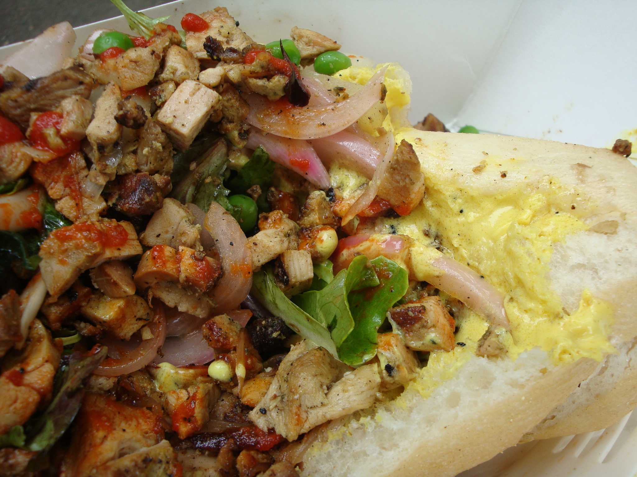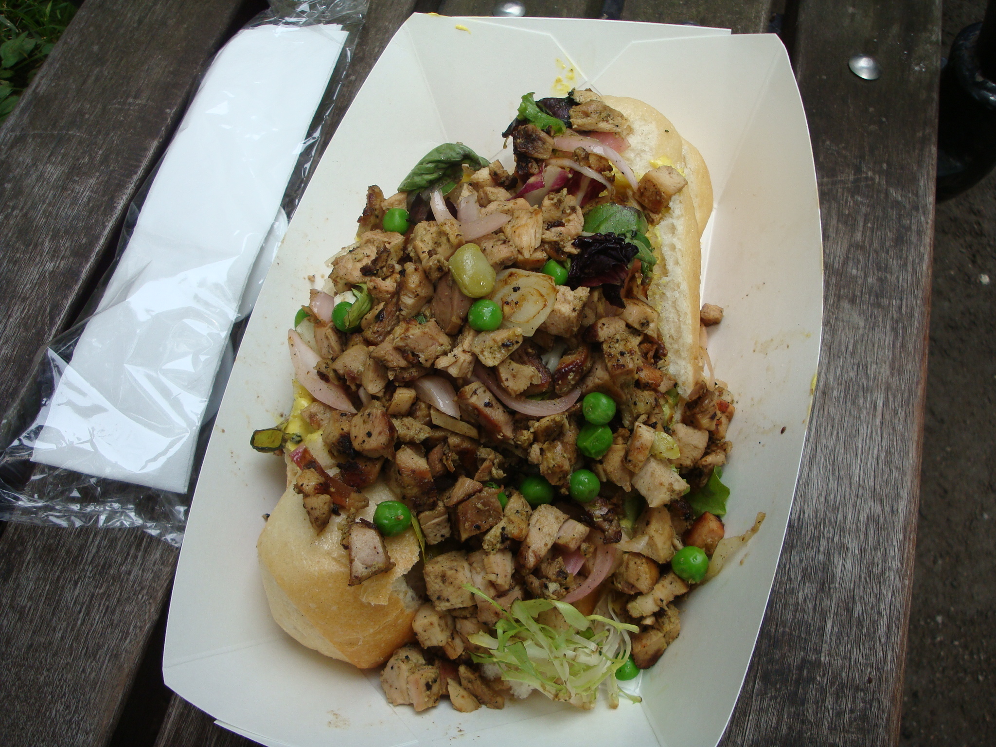 Clearly I had to get the bunny chow since that’s not available from a cart any other time. It was described as chicken curry in toasted hollowed out bread. Those were the basic components, but it wasn’t exactly like they just dumped some Indian curry in a bread bowl. Instead they took a large hoagie-type roll and hollowed it out, dumped a creamy yellow curry sauce in, and then put the chopped up chicken with peas, red onion, and lettuce on top.