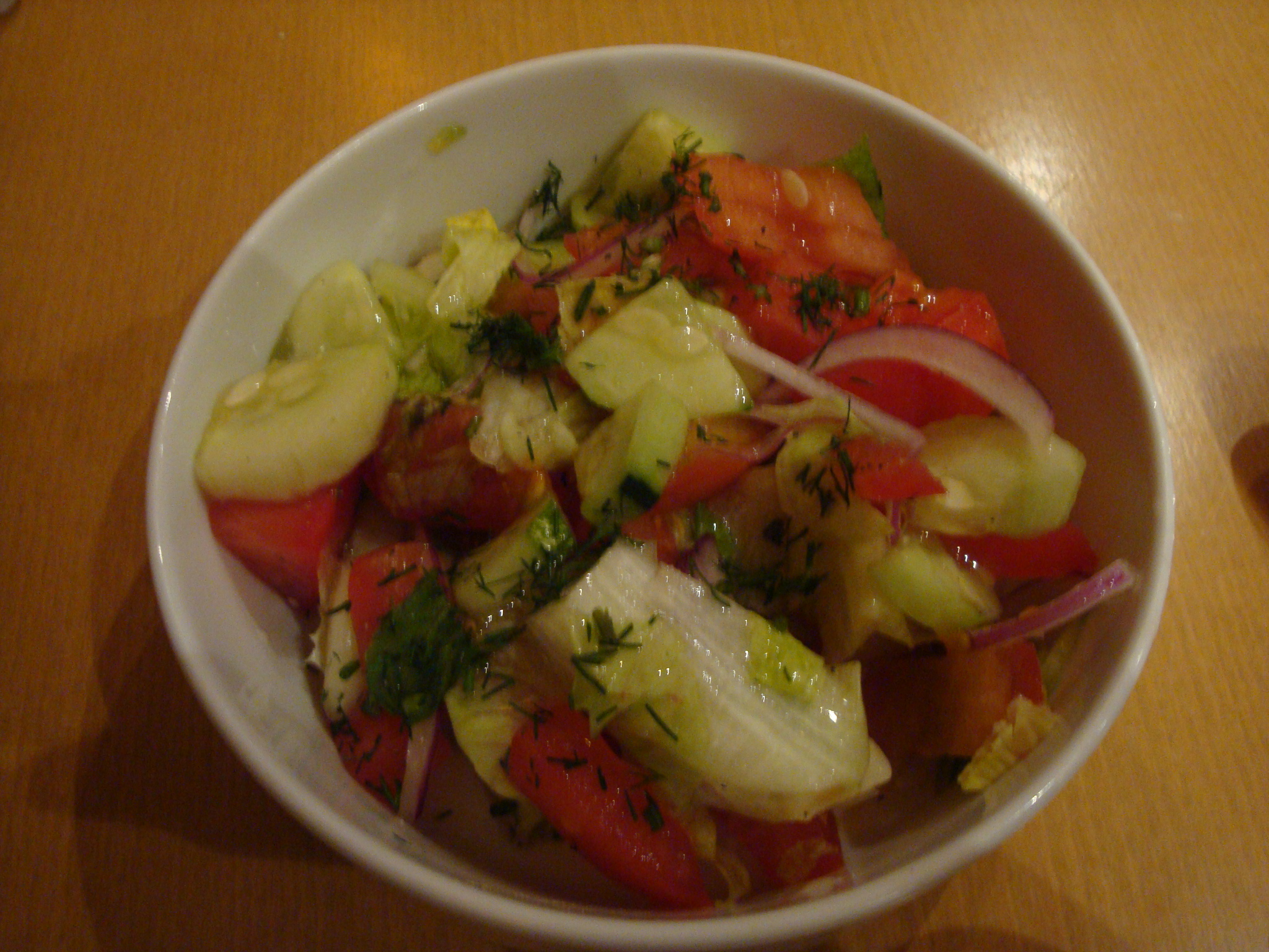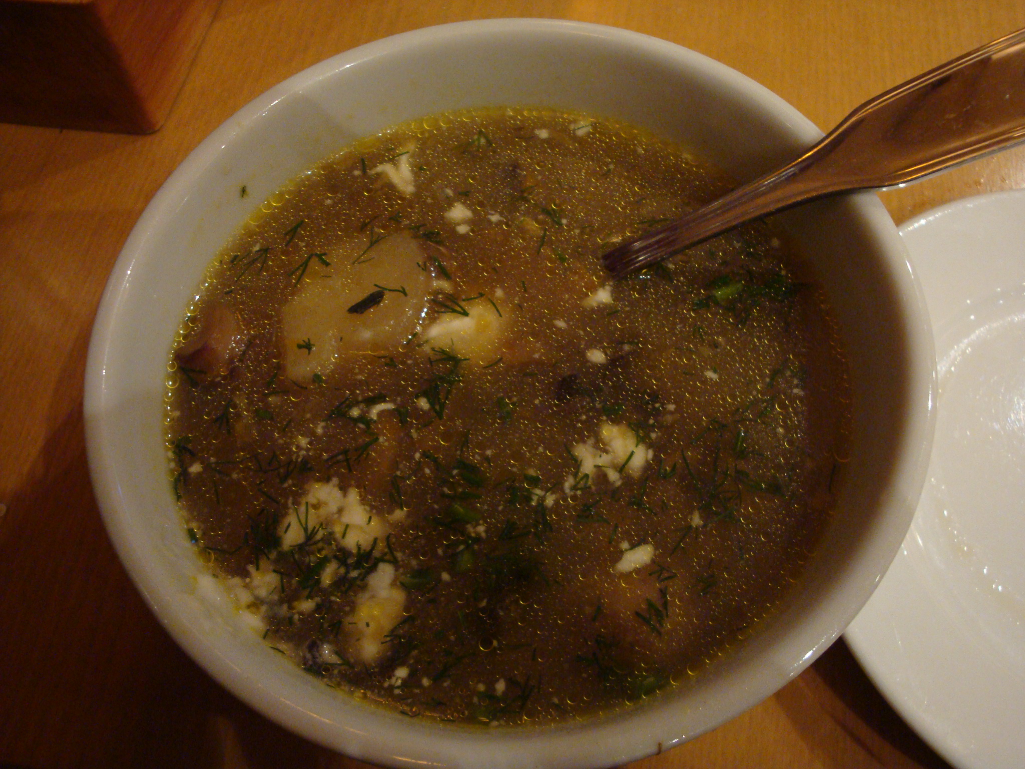 Once you walk up the stairs to the small dining room (complete with Russian TV playing) you get a menu outlining the options for the three-course lunch that includes salad, soup and an entree. I brought along a co-lunch’er to sample more things and we both had a hard time deciding what to eat. One thing that this lunch has in its favor is that the $11.95 includes your choice of bottled water, soda or something called “compote” that appeared to be a fruit juice.