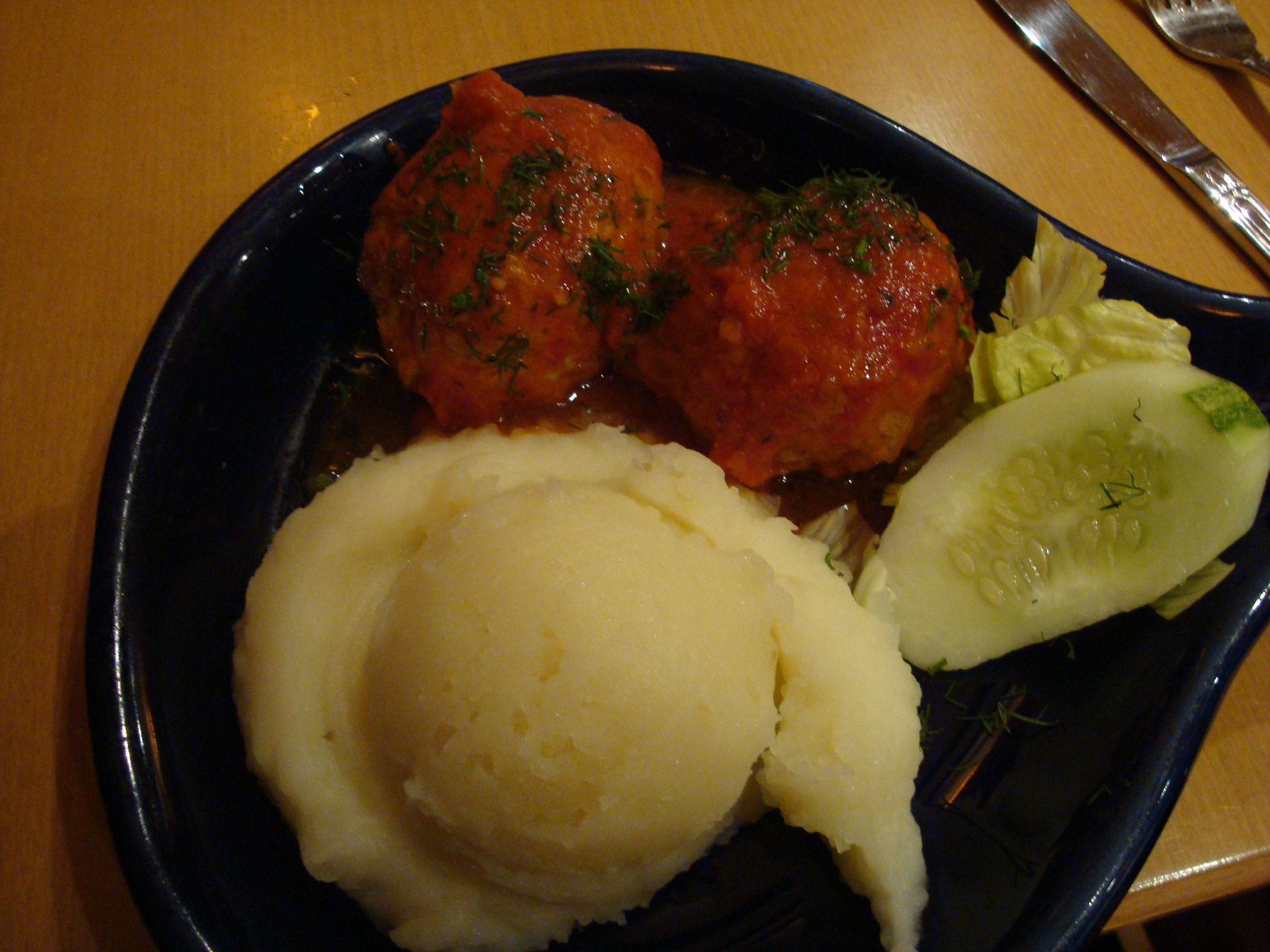 For my main course I got the tefteli, which were two giant chicken and rice meatballs with a tomato sauce over it. You get a choice of potatoes, rice, french fries or vegetables with, so this is not exactly a light lunch. They were some tasty, tasty meatballs. The mashed potatoes were…well potatoes with nothing on them. At least they weren’t covered in dill.