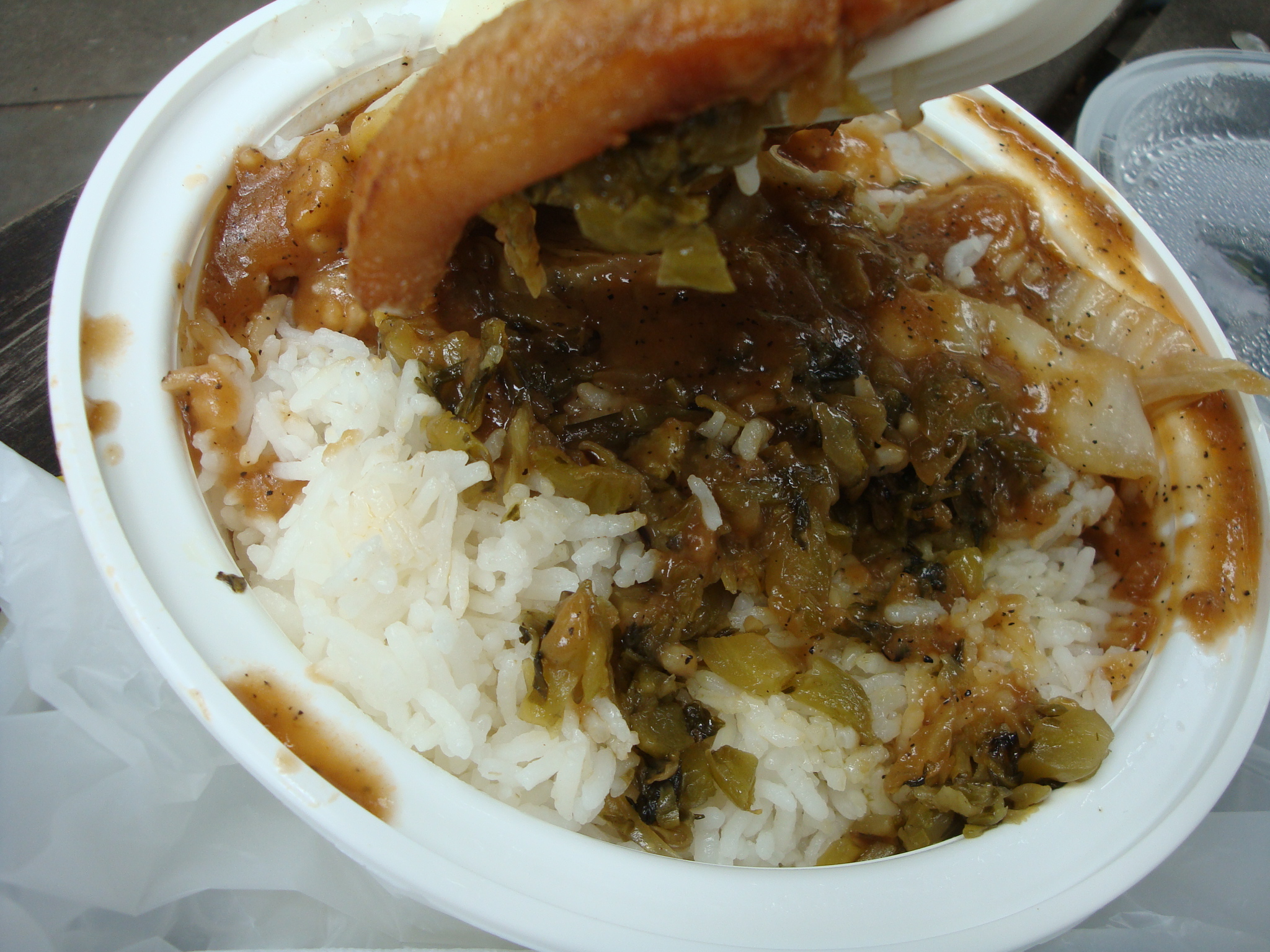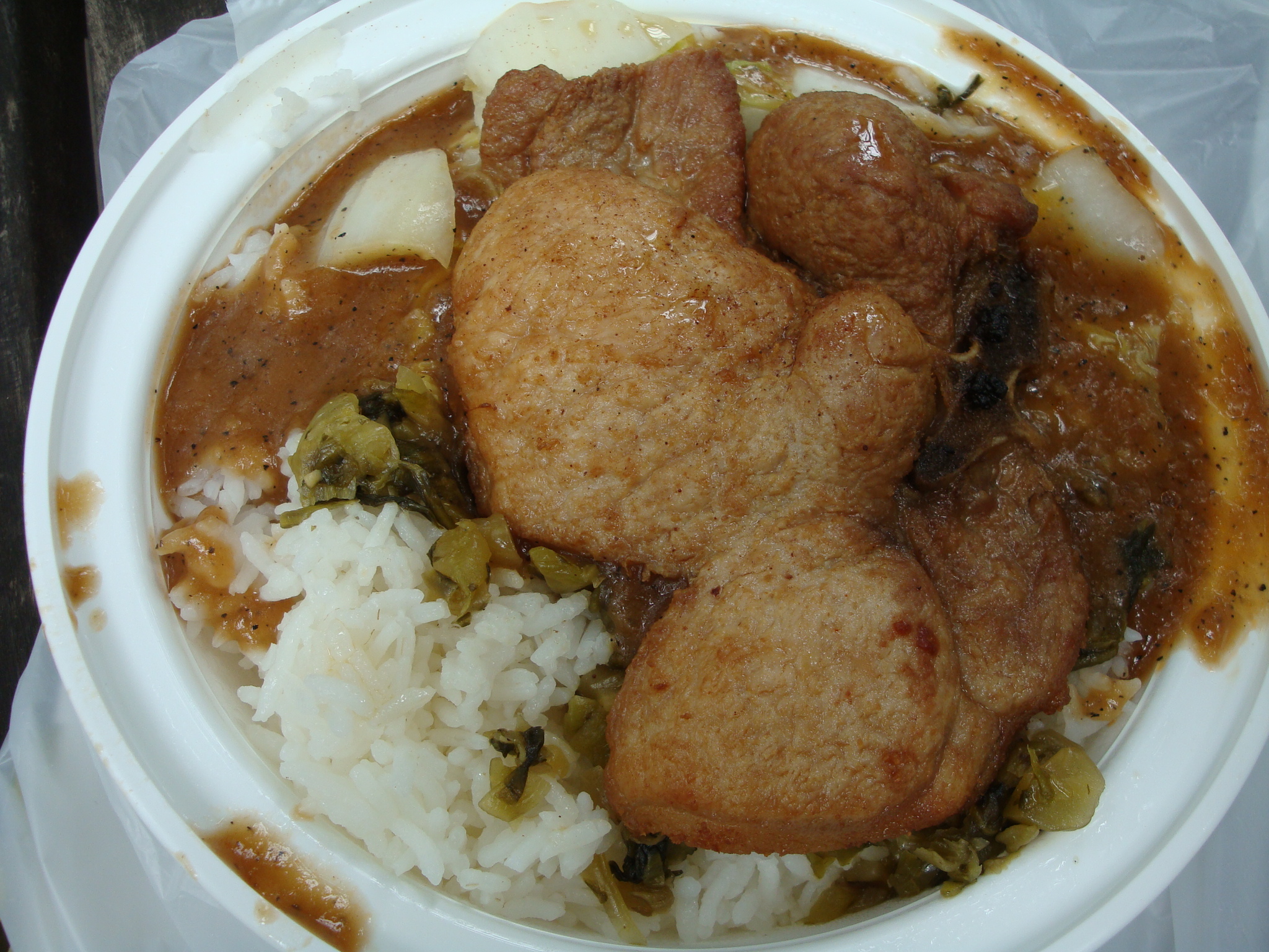 The best part for me was underneath where the pickled vegetables and rice sat bathed in some sort of porky, peppery gravy. This lunch also marked the first time I’ve ever picked up a pork chop and eaten it in a park, because seriously, who can eat a whole pork chop with only a flimsy plastic fork?