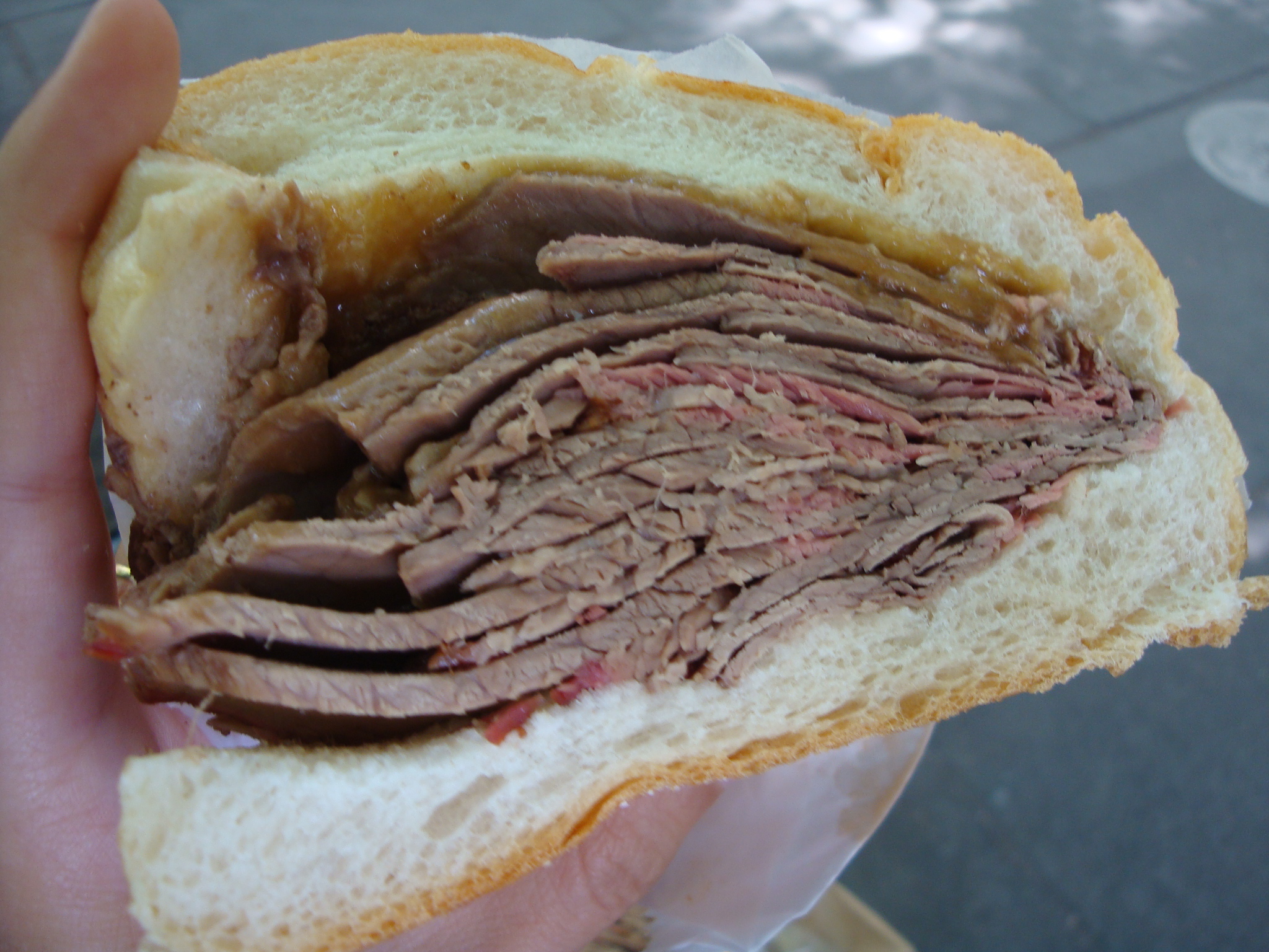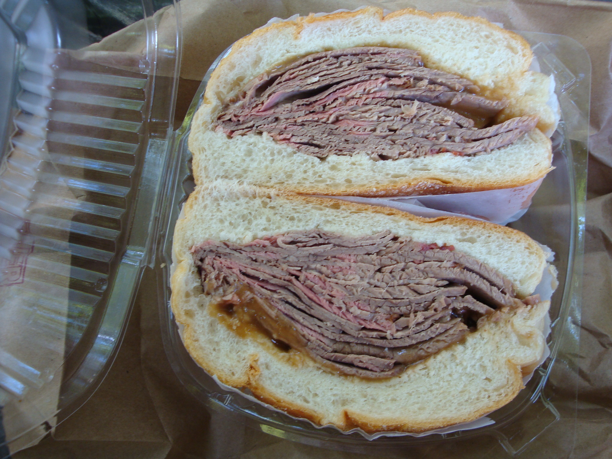 When I ordered I was told they were out of pastrami already, dashing my hopes of that Reuben. So instead I went with plan B and got the brisket on a roll with gravy ($6.75). I saw the guy slice the over-sized roll, ladle some gravy on the top bun, and then came the magical part where he took the hunk of brisket to the slicer and went to town for my sandwich. I was impressed that in the midst of an insane lunch rush, they don’t preslice the meat. It says on the menu that they make everything in-house, and I actually believe that.