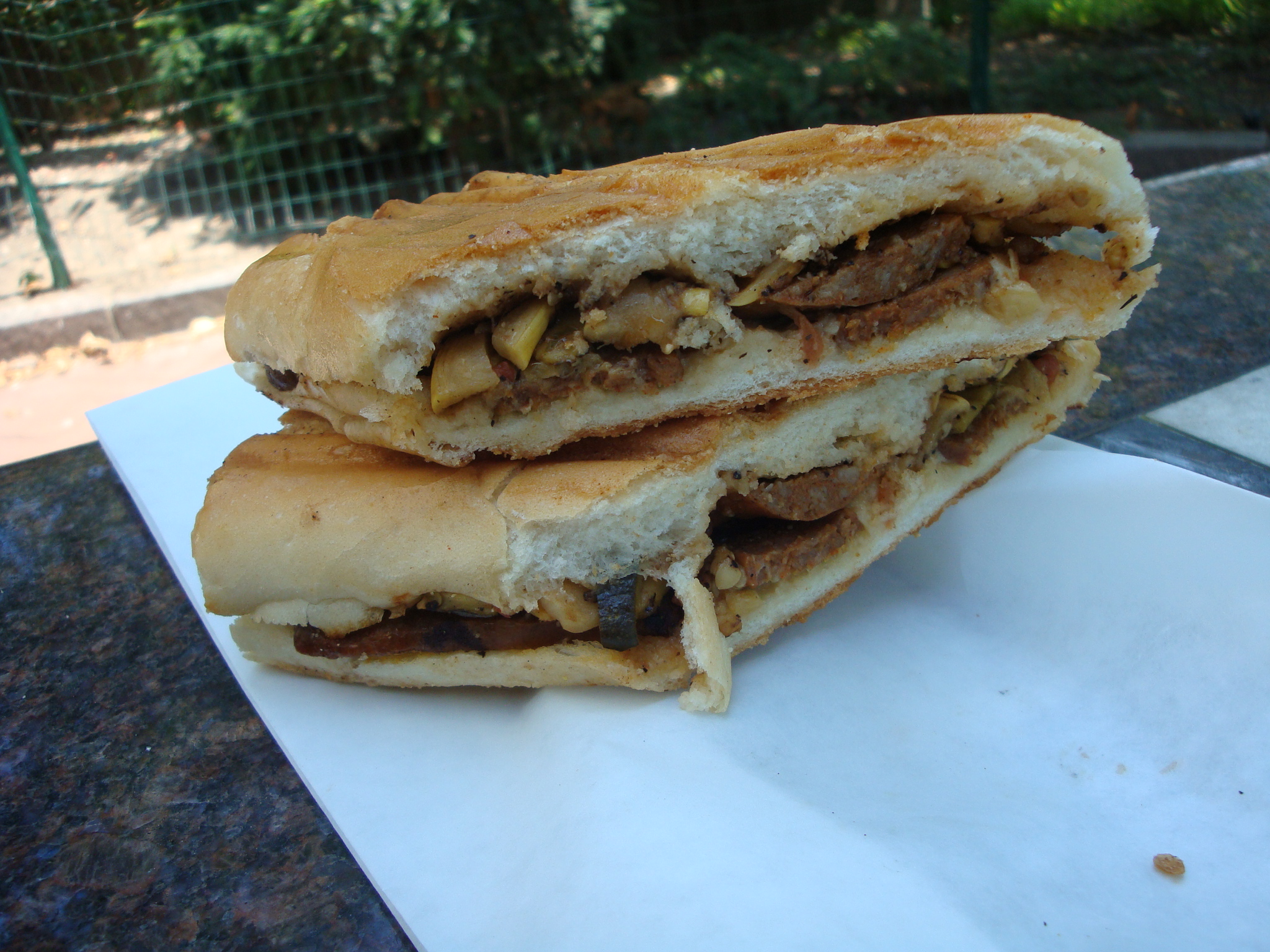I was a little nervous at first about my plan B, as The Pantry serves only sandwiches, salads and soup. Boring! Then I looked at the menu a little closer and liked what I saw. We’ll just forget about the salads, but they have things like a croque monsieur ($5), Spanish chorizo and manchego ($6.50), prosciutto and farm cheese ($6) and then the one that caught my eye. That would be the merguez sausage with ratatouille and roasted garlic. You had me at merguez, Pantry.