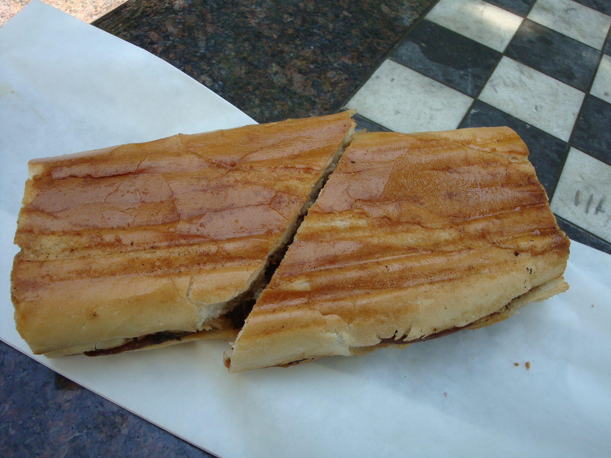 Since the place kind of looks like the lackluster Picnick kiosks in Battery Park, I had pretty low expectations and was thinking this was going to be a premade and reheated affair. Well, in actuality they make the sandwiches from scratch, meaning you have to wait 5 minutes or more to get your food. I was handed a flat package and wondering if this sandwich was even going to fill me up for its $6.50 price tag. when I took it out, it resembled a Cuban sandwich that had been pressed until the bread was crispy but wasn’t all mangled like at those crappy panini places.