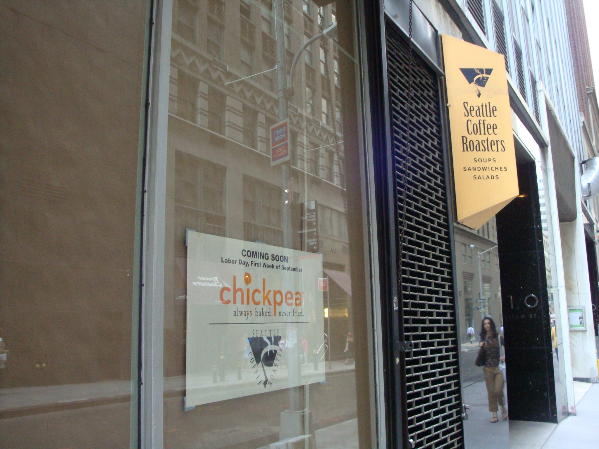 There is another, more exciting, chain also coming to the FiDi. That would be Chickpea, which is opening a branch on John St. near William where a Seattle Coffee Roasters used to be. There are three other branches in the city serving its brand of baked falafel and shawarma. The sign in the window says its opening the first week of September and it looks like they’ll still be serving the Seattle Coffee Roasters brew, if you’re a fan. The menu looks pretty good, and they serve a salad topped with both shawarma and falafel that I can definitely get behind.