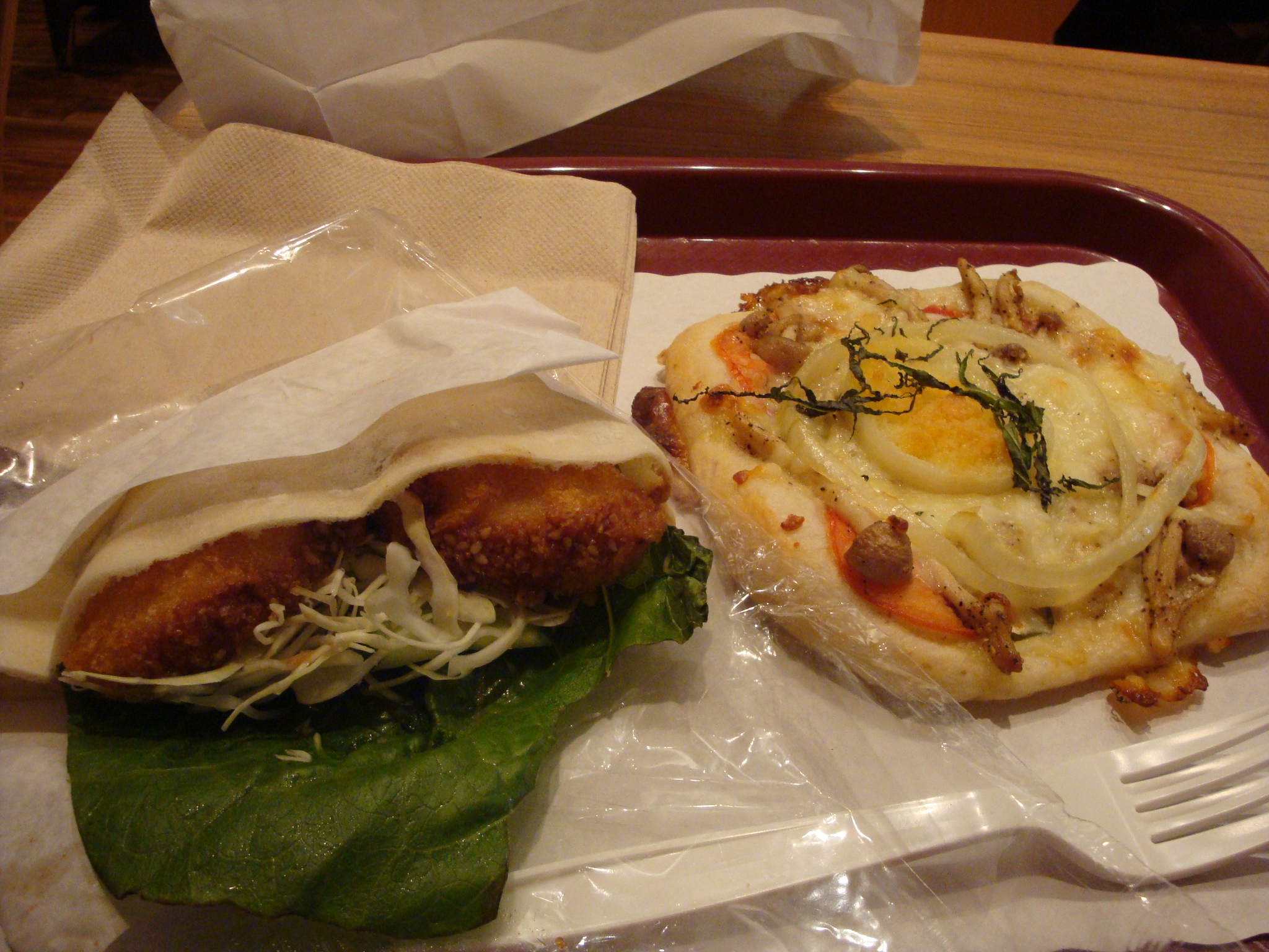 The cream croquette sandwich ($3.25) caught my eye, mostly because it was cheap. I was going to get a soba noodle salad that I was told involved black bean paste, but instead went for a personal pizza-looking thing ($2.95) that had mushrooms, tomato and onion on top. They also had a Hawaiian version and another with random vegetables like corn. Most of the stuff is vaguely labeled, but staff is pretty helpful and notices if you’re looking confused.