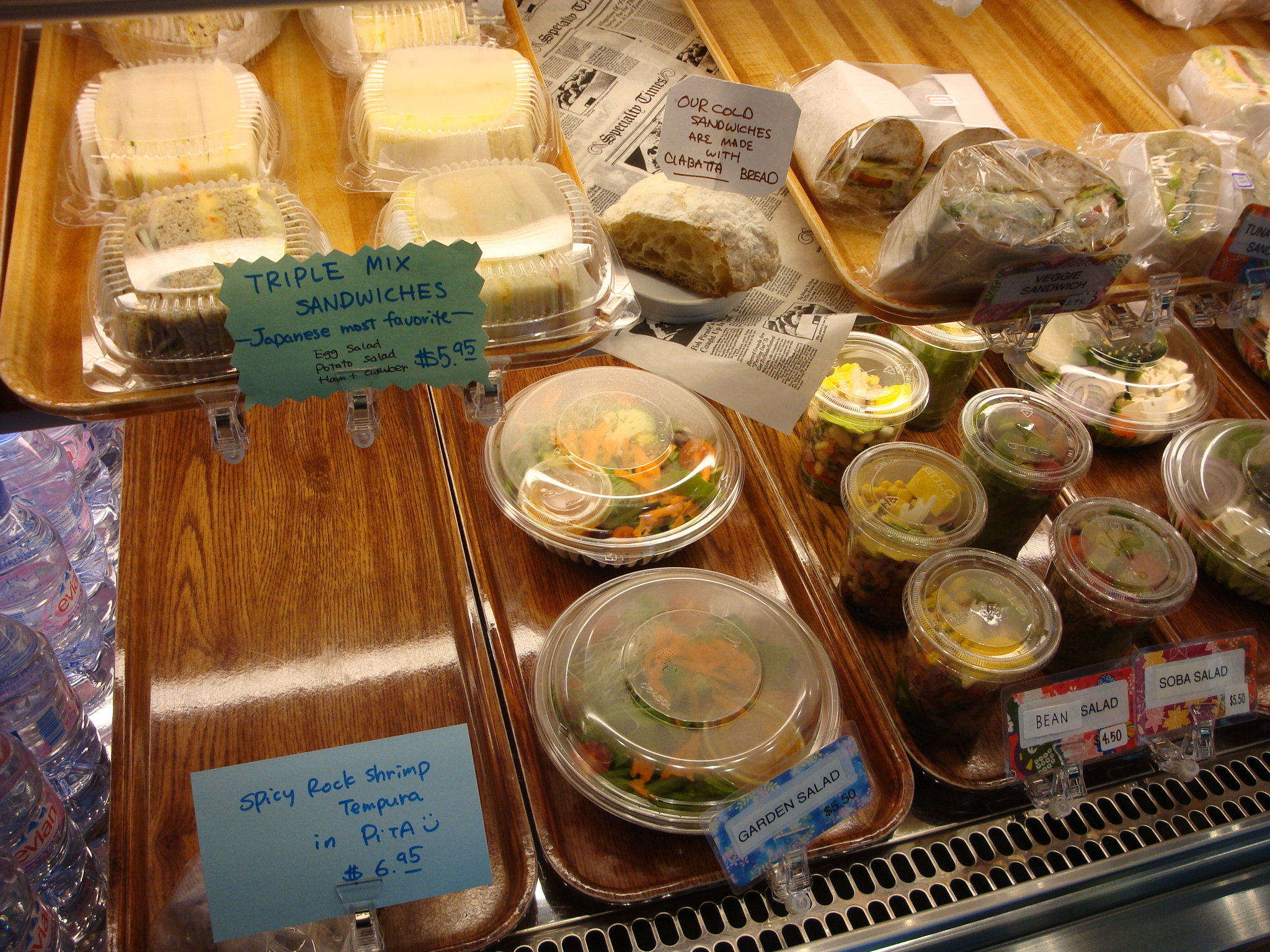 They were out of a couple of things I was eying in the bakery section, such as a curry ya pan. And sadly, I saw a wasabi weiner (their name, not mine) wrapped in delicious looking pastry. Really, there are an infinite number of lunch combinations you could throw together from here to create pretty much the best $10 and under meal ever. Instead I went over to two displays of sandwiches and other lunch goods like salads, some hot and some cold.
