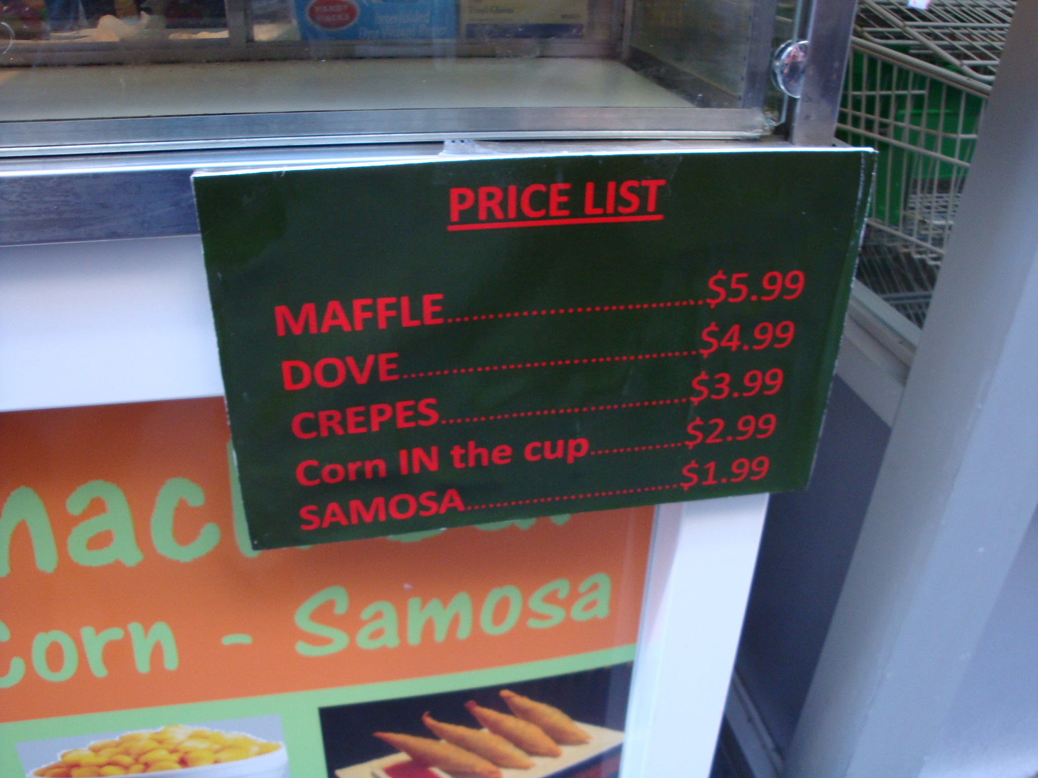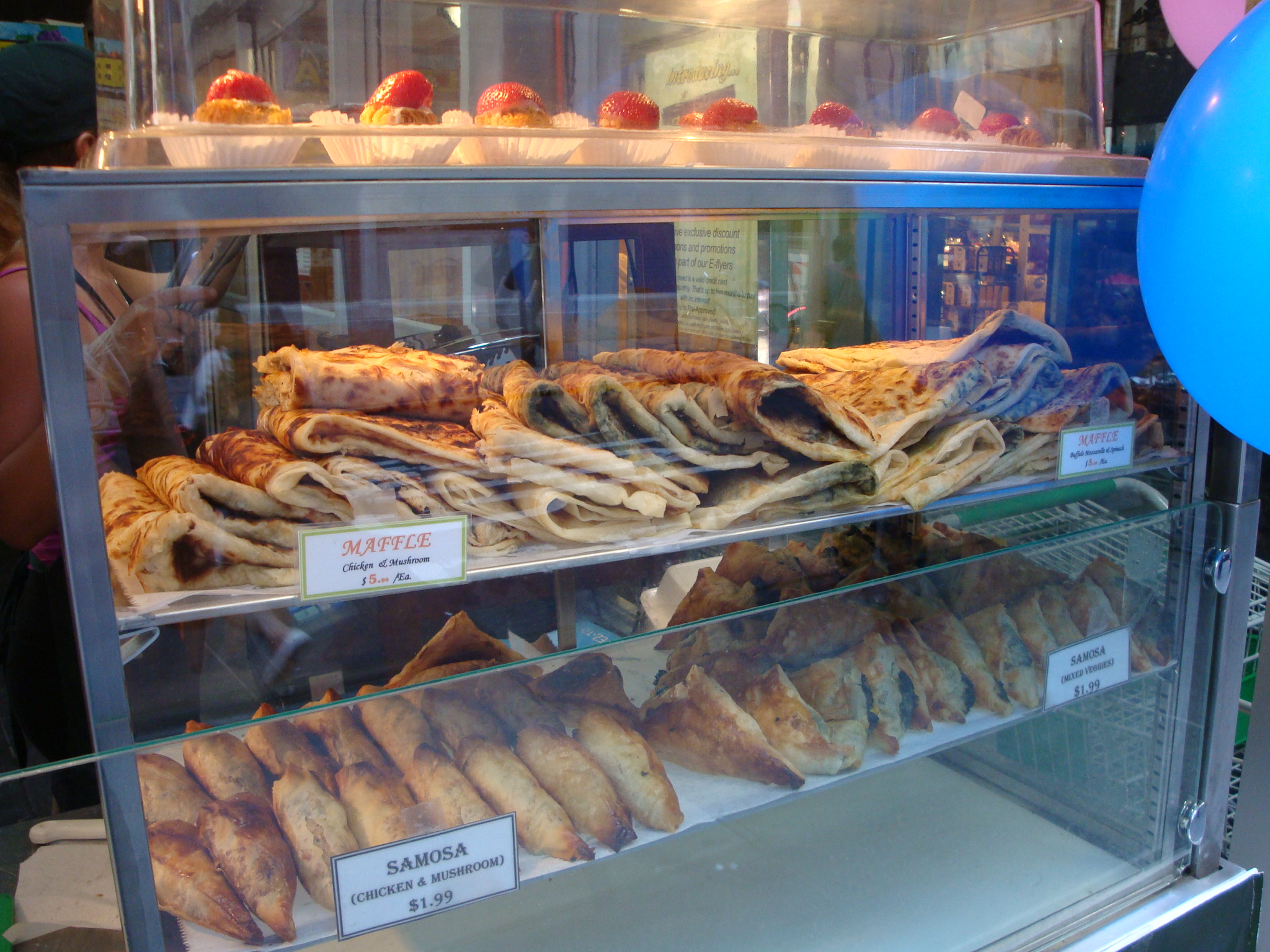 Grocery store/lunch favorite for tons of downtown office works Zeytuna has had what they call a Mediterranean snack cart set up outside on John St. (at Nassau) for a little while now, and I have been meaning to try it. I didn’t so much want to eat there because it was new, but because they seemed to have a pretty random assortment of food. We’re talking something called a maffle, some sort of sandwich called a dove, crepes and “corn in the cup.” Oh, and samosas! After asking what corn in the cup was, I was told they don’t have it anymore and will be replacing it with ravioli. Random! Since the cart will probably only be there as long as the weather is nice, and I really wanted to know what the hell a maffle was, this finally became my lunch destination.