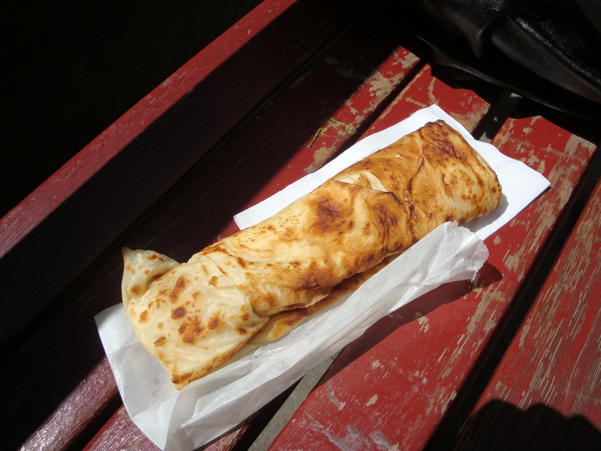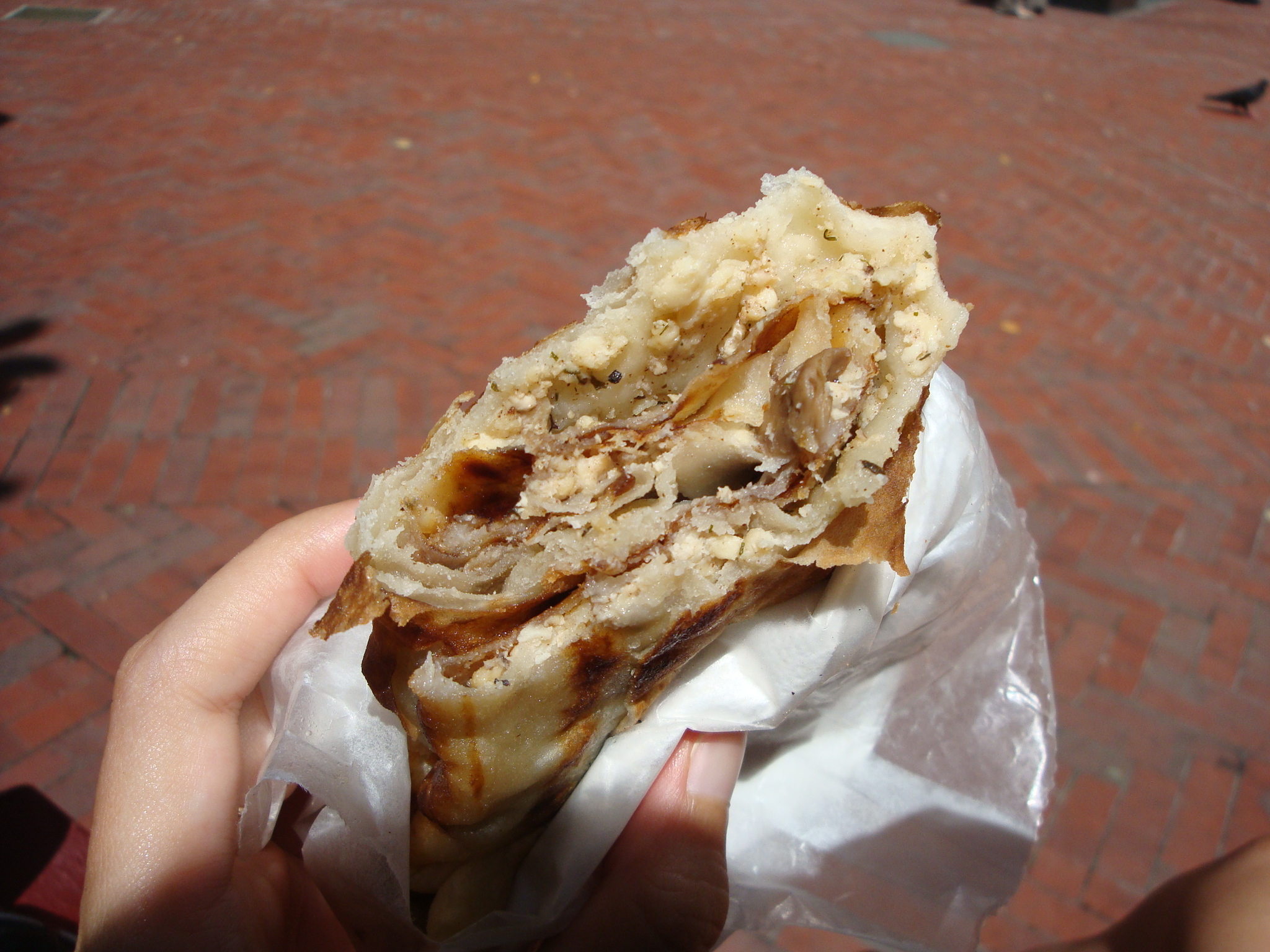 The maffle reminded me of either a Jamaican roti or a kati roll, except the filling was baked inside the bread and then rolled up in burrito shape. Since it was about 90 degrees out that day, I wouldn’t have minded eating it as is, but instead it was thrown on a sandwich press and heated to hand-searing temperature. Seriously, it was like the kati rolls from the Biryani House cart all over again.