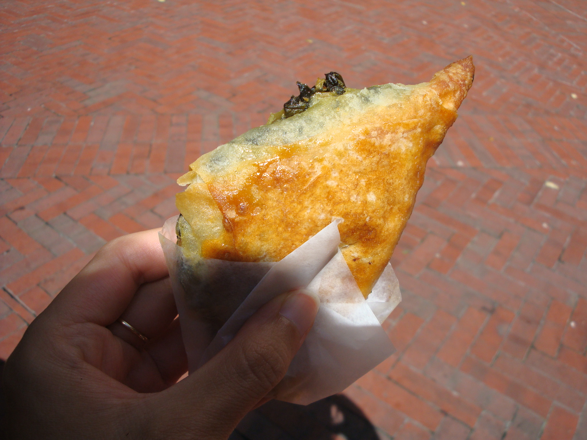 The two kinds available are chicken and mushroom, and buffalo mozzarella and spinach. You would think feta would be a little more Mediterranean, but I guess not. I also sprung for one of those samosas ($1.99), which was more like a bureka, in my opinion. Those also come with either chicken and mushrooms or vegetables. Basically my lunch was a couple of things encased in greasy bread.