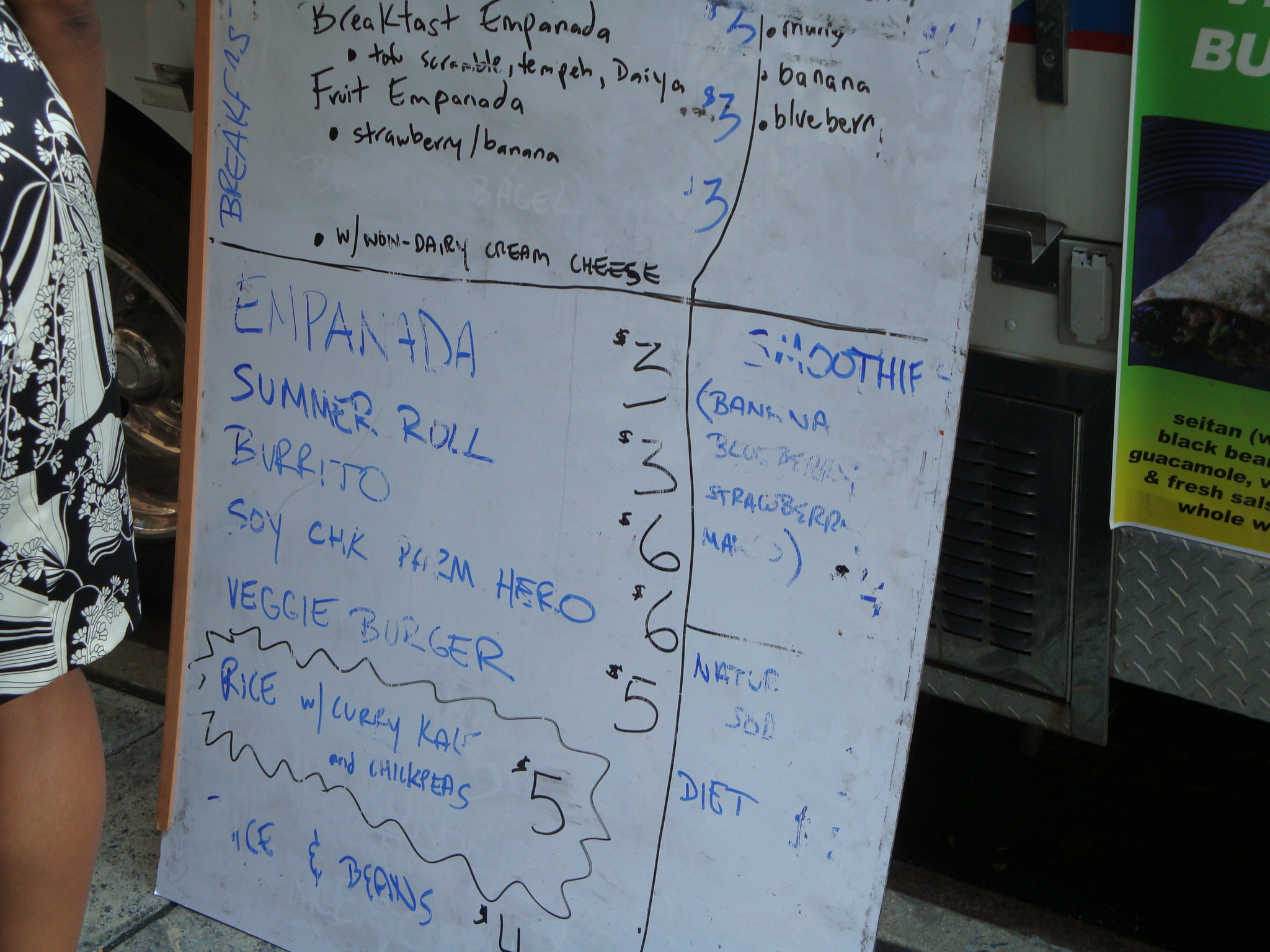 The truck is an offshoot of Brooklyn’s V Spot Cafe, and people seemed to be into the healthy eating option because there was a line. Or maybe they were just like me and got all excited when they saw the words empanada and rice and beans (which they were out of). They also have a somewhat random menu of summer rolls, veggie burritos, veggie burgers, a “chicken parm” that just sounds wrong and something involving curried kale. Everything is between $3 and $6, so you could definitely get a sort of filling meal for under $10. If you were one of those who ate here on Wednesday, first impressions are welcome in the comments.