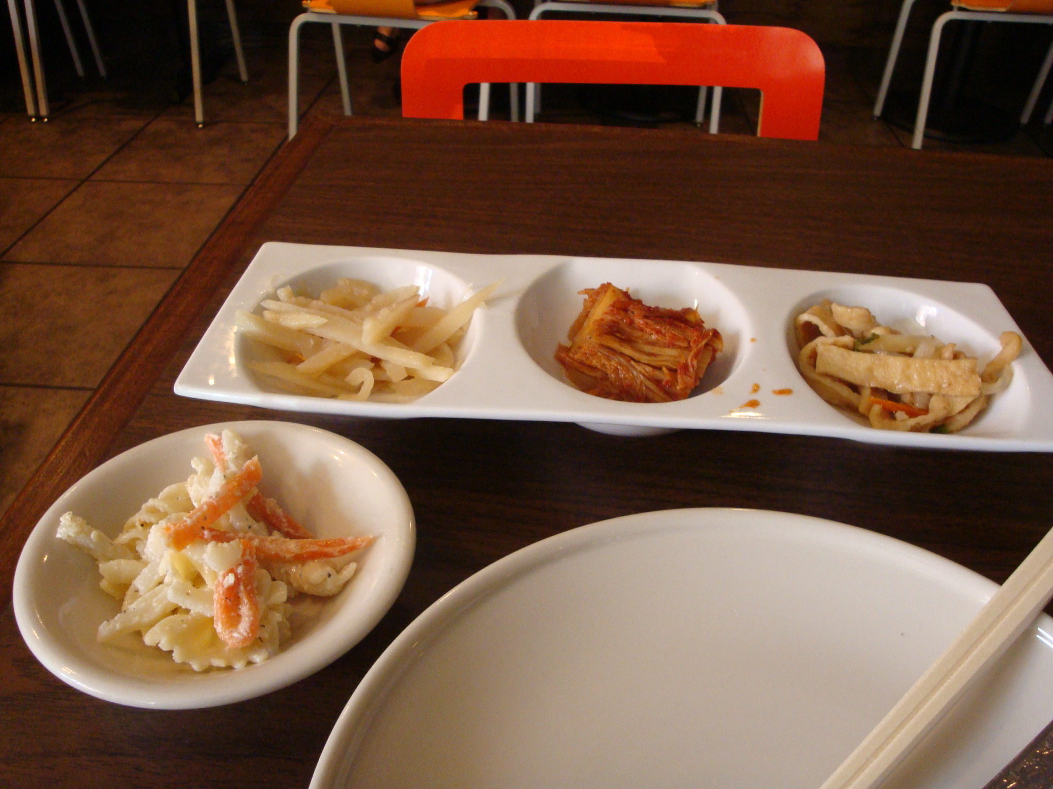 First, you get the side dishes – four of them to be exact. I think they may give different ones depending on what they have around so I’m not going to go into great detail other than saying there was a pasta salad, some cold potato and onions, cold wheat noodles and a kimchi-esque pickled vegetable. Oh, and they also asked if I would like more sides once I had finished most of what was there, so hearty eaters take note.