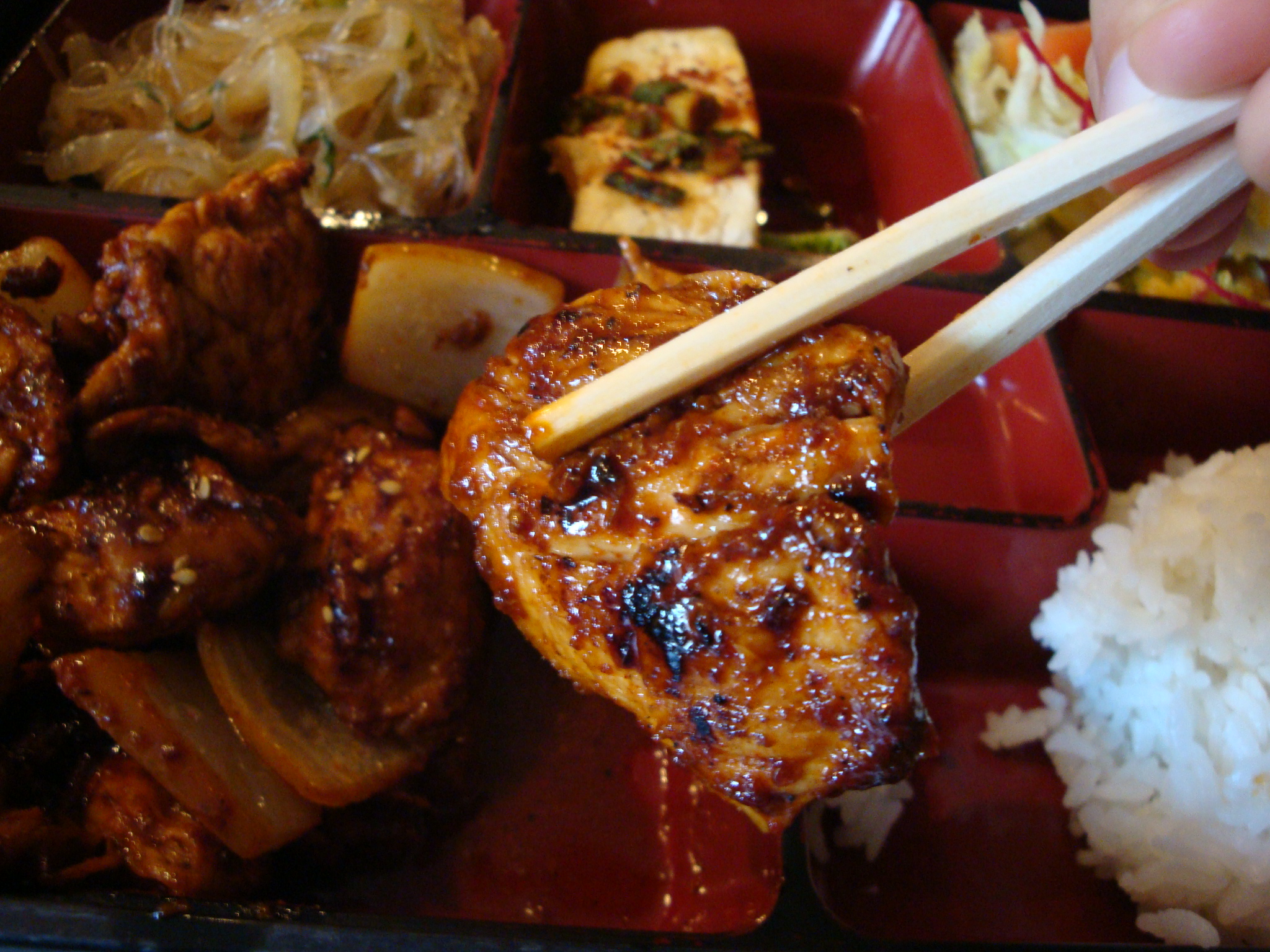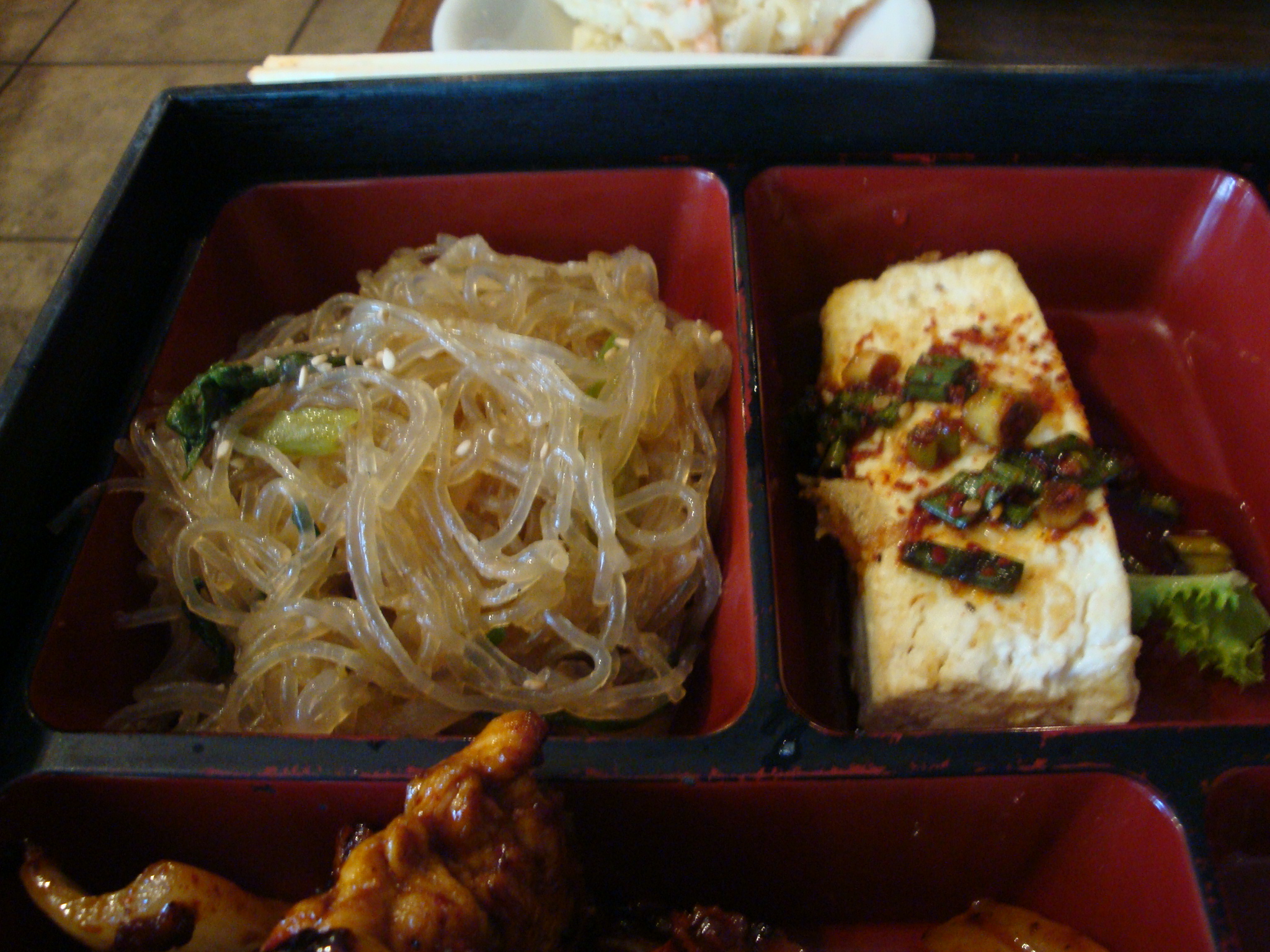 In addition to a generous pile of meat, you get some rice, lettuce salad, tofu and some jap chae. The chicken was white meat, but had been grilled and was pretty great although not particularly spicy.