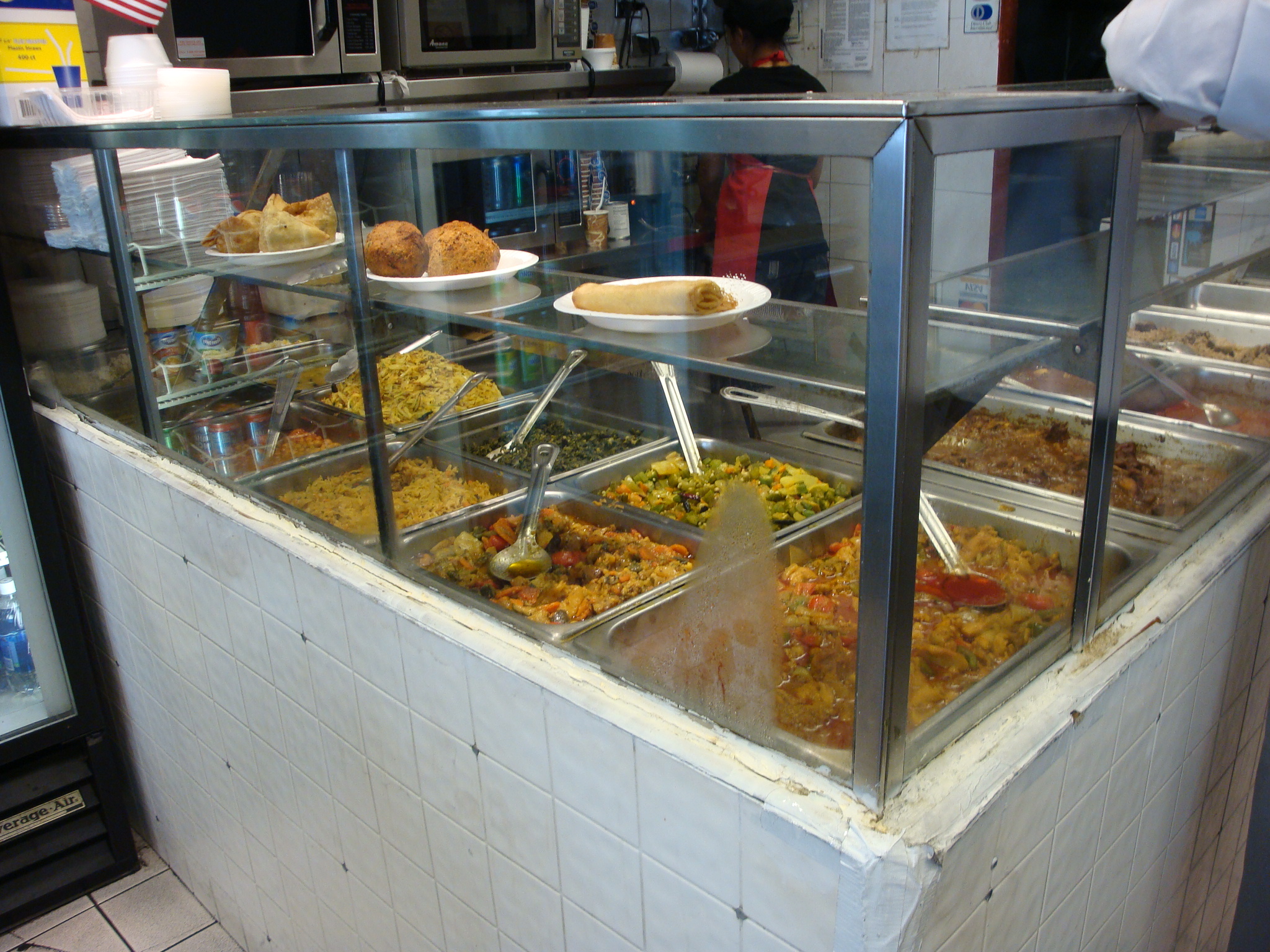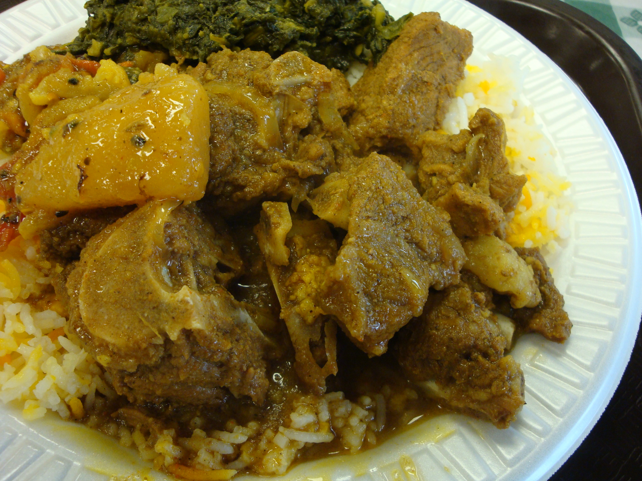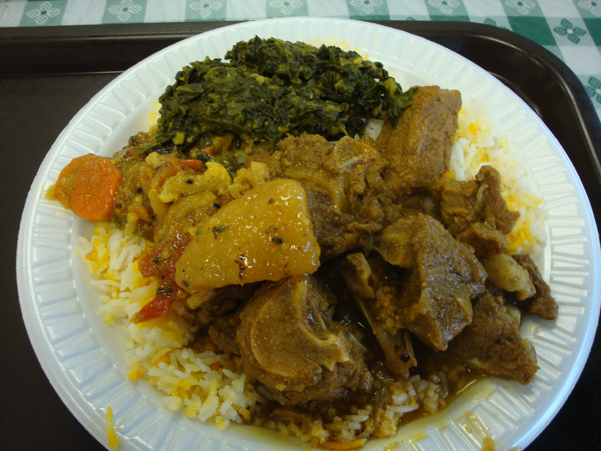 The service, much like the place itself, is no frills. You walk up, specify which combo you want (meat or no meat) and whether you want rice or naan. The day I was there they had chicken and goat, and I am not one to pass up eating a gamy animal so I went with the meat option. The tough part was choosing the two vegetable sides. A sign on the outside says the combo is $6, but I was charged $7, so you might want to ask the price before ordering.