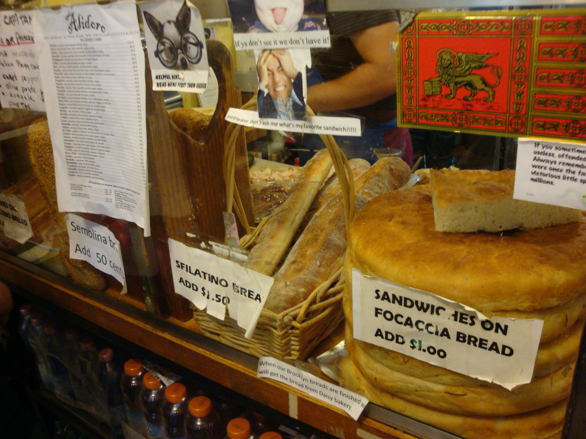 If there’s one place in Soho that’s always on everyone’s list to check out, it’s Italian sandwich shop Alidoro on Sullivan St. (btw. Spring & Prince). I am not a big sandwich person and no one really told me just why this place was so awesome. Was it the bread, the ingredients, what?!? After seeing it listed in a Downtown Lunch’er profile and then another, (and finding out even Zach has eaten there) I took the train up there (and really I should probably take advantage of this before they make good on the talk of getting rid of unlimited-ride Metro cards). Bread, meat and cheese after the jump.