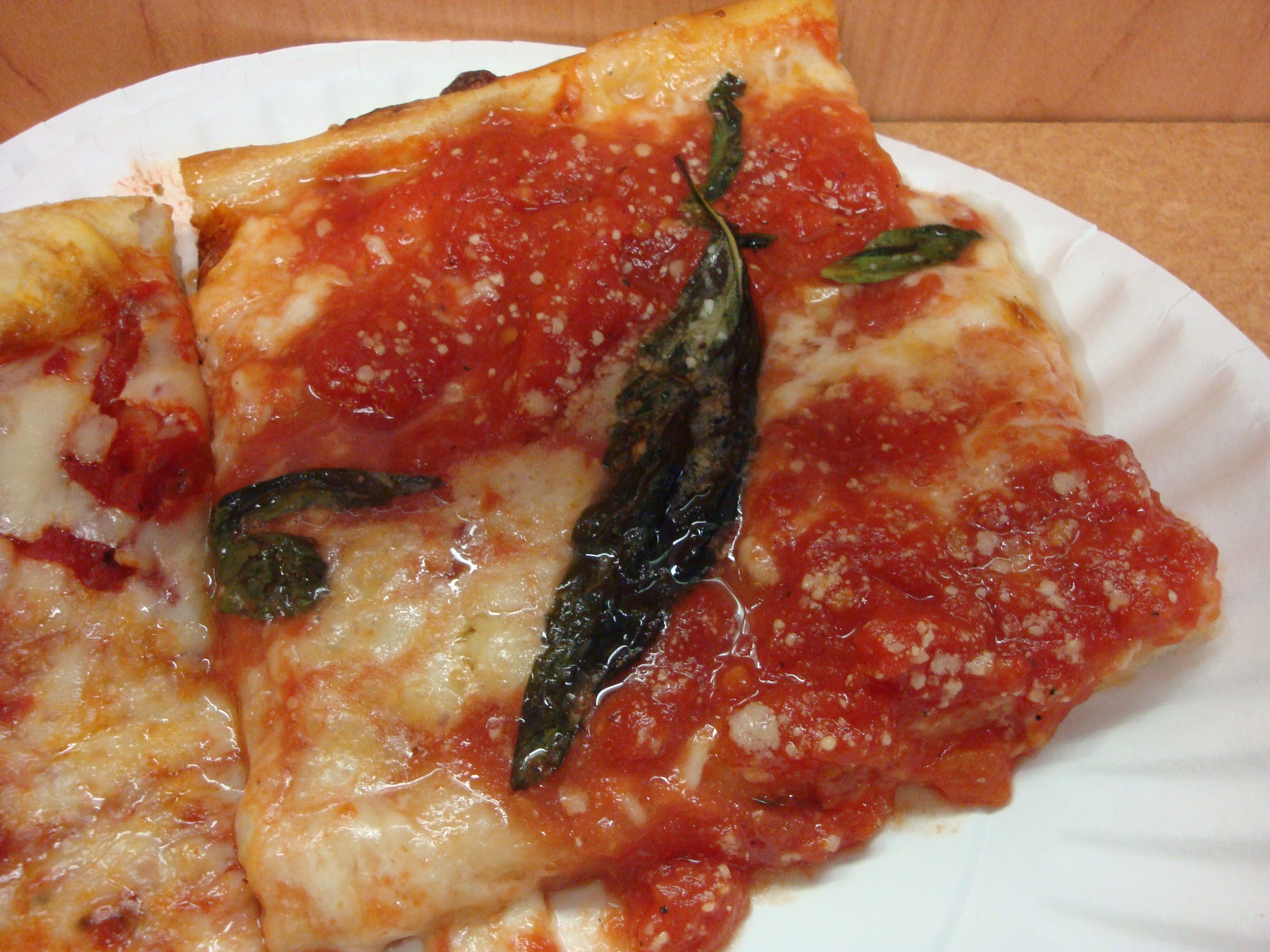 After a disappointing slice experience recently, I’d kind of shied away from pizza for a while. One day that I didn’t have much time for lunch I headed over to Majestic Pizza & Calzone on Cortland (btw. Church & Broadway) on the intel that they had a good grandma slice with fresh basil. I have maybe eaten one grandma slice in my life (unless you count what those in the Midwest call pan pizza, of which I have eaten a lot), so I was happy to make this No. 2.