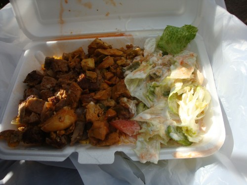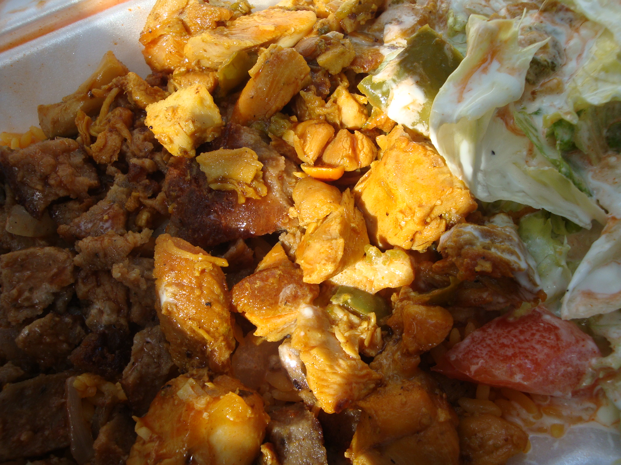 The guy annihilated my salad with white sauce, and then proceeded to do the same with the hot sauce on the meat. This wouldn’t have been such a bad thing except the hot sauce clearly contained Tabasco and that’s all I could taste on both the meat and rice. It was actually kind of good, in a street meat/buffalo wing mash up way.