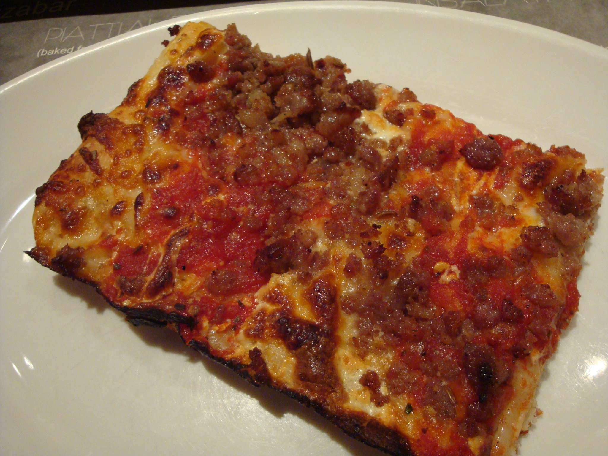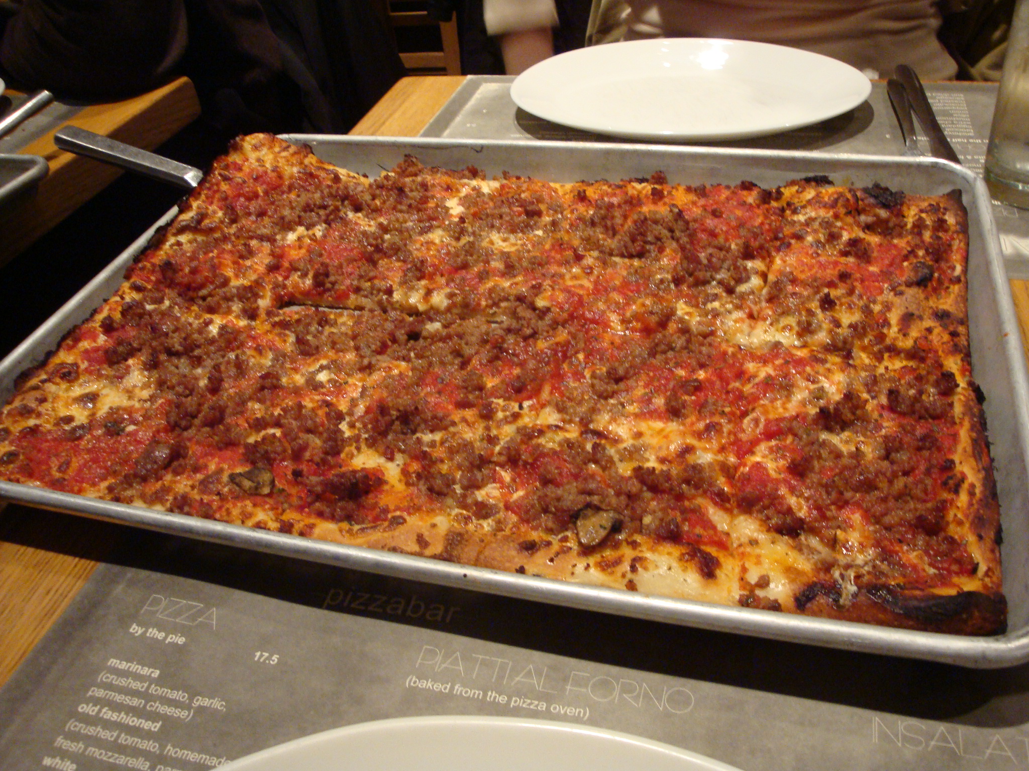 We ordered an old fashioned (they also have marinara and white options) with sausage for an extra $3. The slices are rectangular with super thin crust. I don’t know that I would get more than one topping on it, although it doesn’t really matter because you’re probably going to be eating with a knife and fork or risk feeling like a person with no manners.