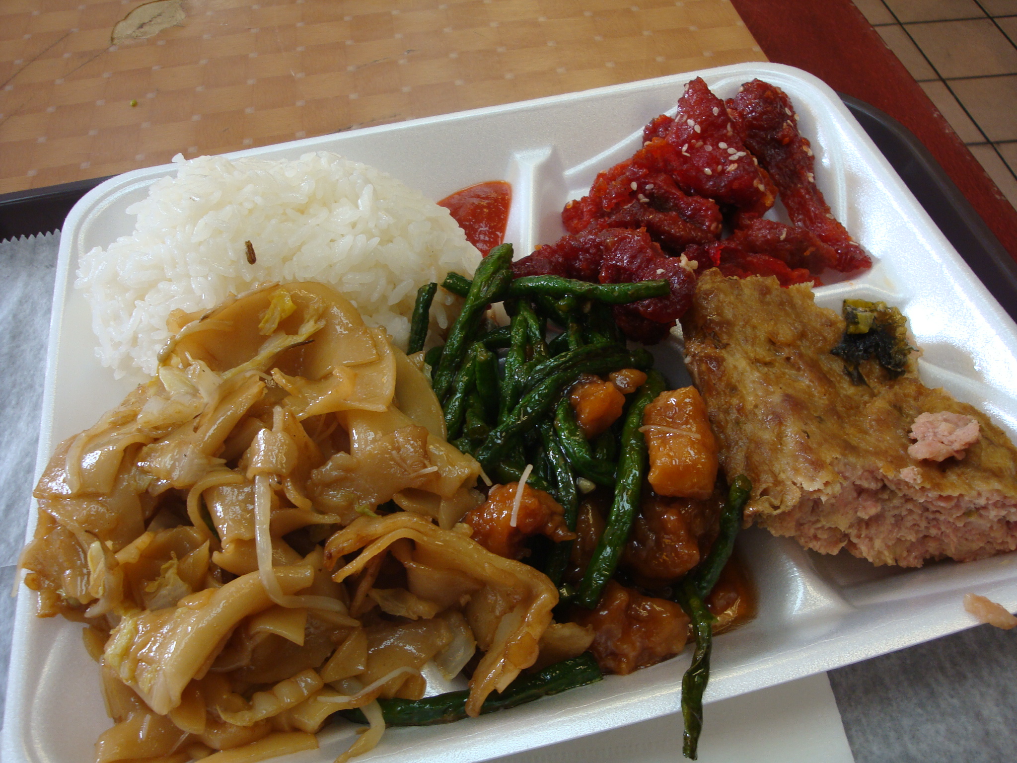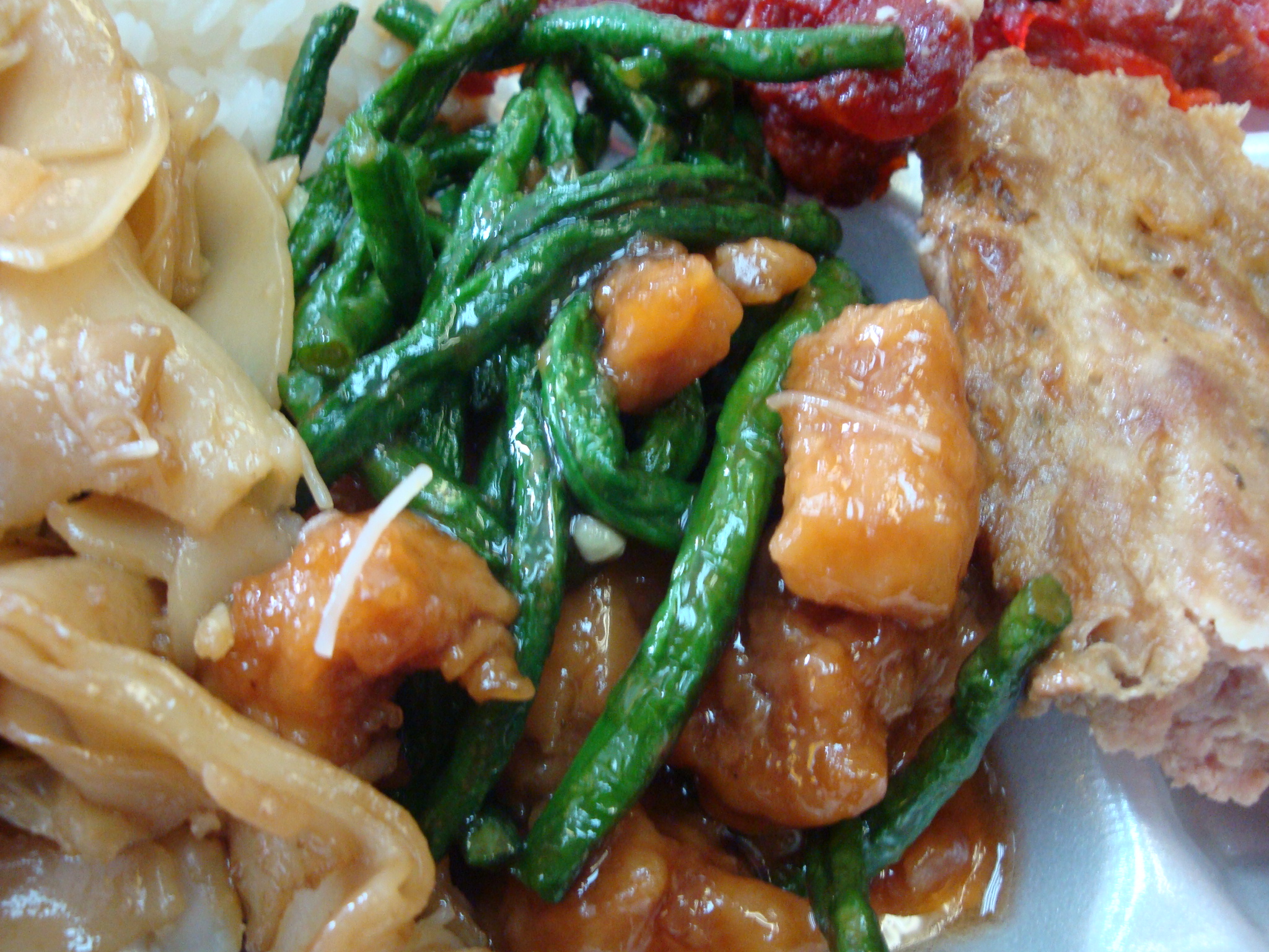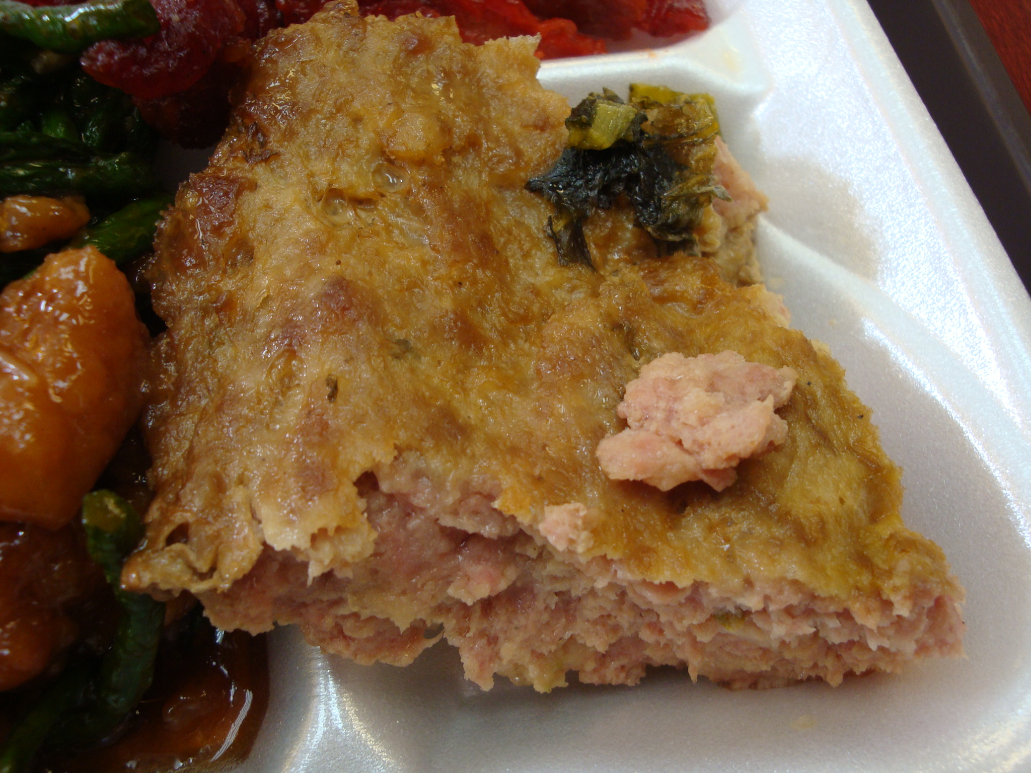 I got a fried meat chunk (chicken? pork? both?) and green bean dish that was in a sweet sauce. This was my favorite item because even though there was an oil slick on the plate when I got done eating it, at least I ate a vegetable! Next up was what I will call Chinese meatloaf. It was a hunk of porky goodness, like the kind of meat that’s stuffed inside dumplings. It was good in a “this is going to give me a heart attack” kind of way. Not recommended if you are afraid of grease.