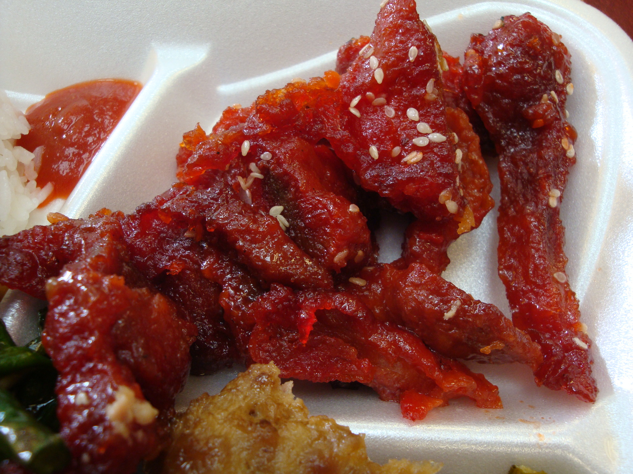Last, is the technicolor pork. I liked this even though there was a lot of fat and gristle involved. Avoid if you are afraid of red food coloring.