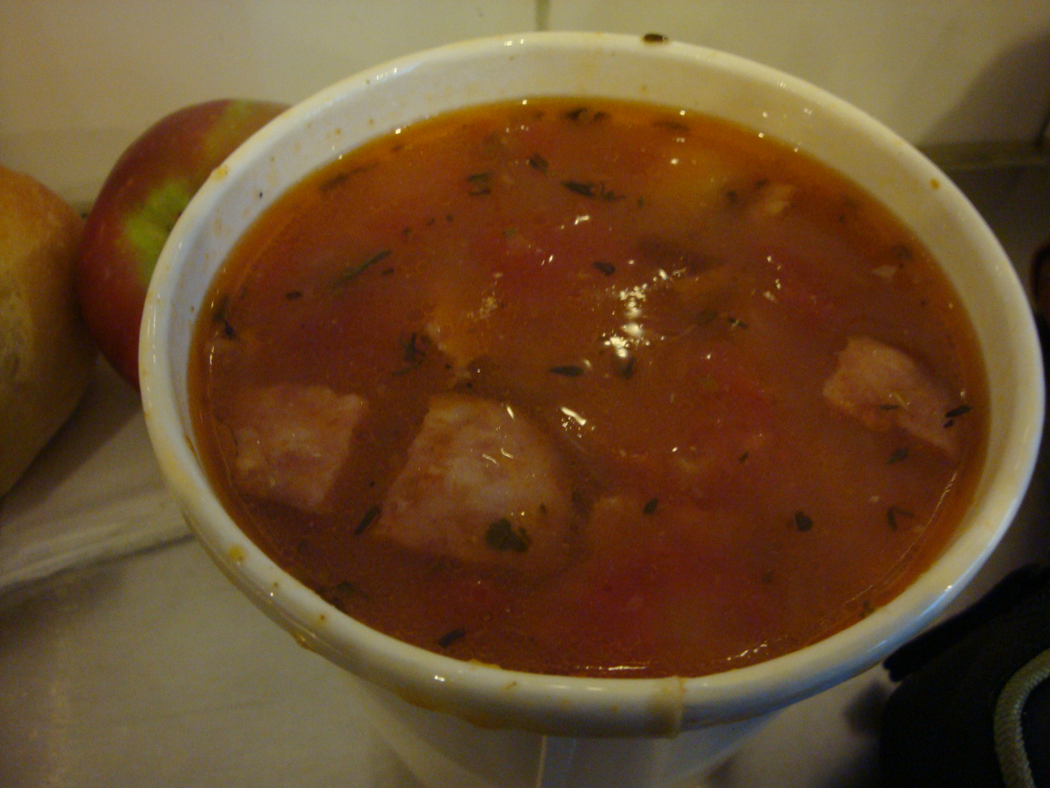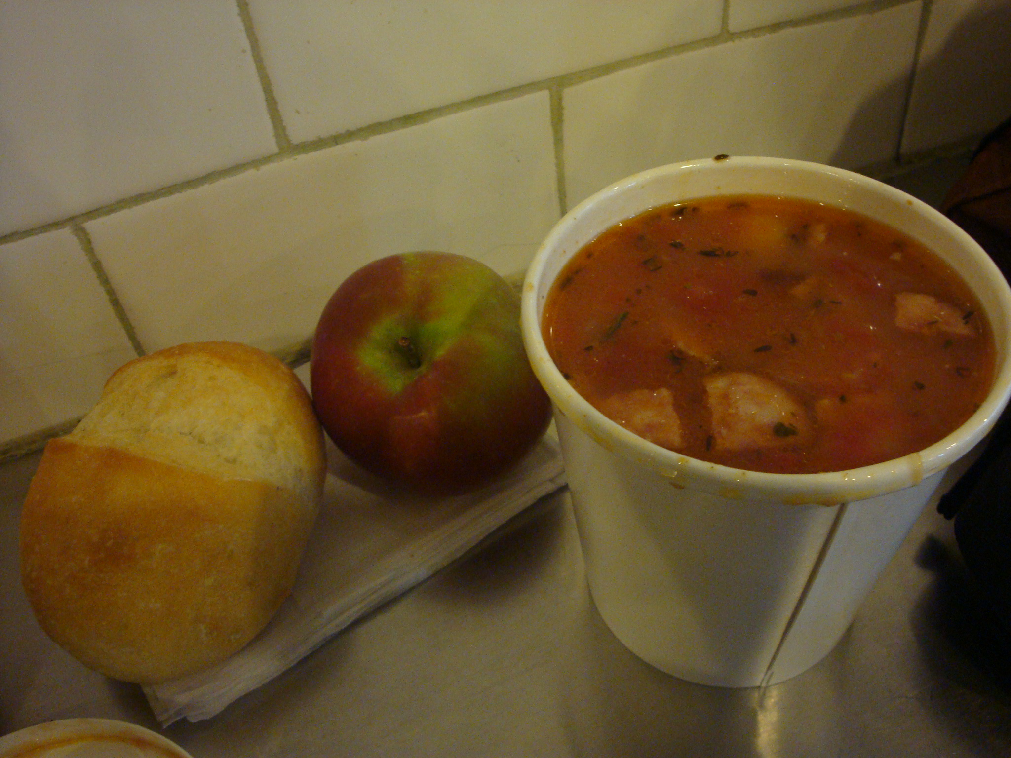 My choice of soup was chicken jambalaya, which I ordered in the second largest size for $5.95. All of the soups come with bread you get to pick from the selection by the cash register and an apple or banana that you can grab from baskets sitting out. Did I mention that this place seems not like a lunch destination, but eating at your grandma’s house? It seems like an older couple runs it, and the woman was manning the cash register when I was there asking everyone if they wanted extra bread. All that was missing was “You’re too skinny! Eat! Eat!”