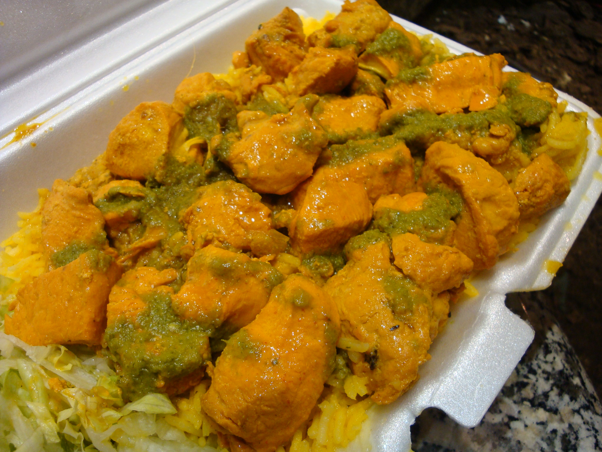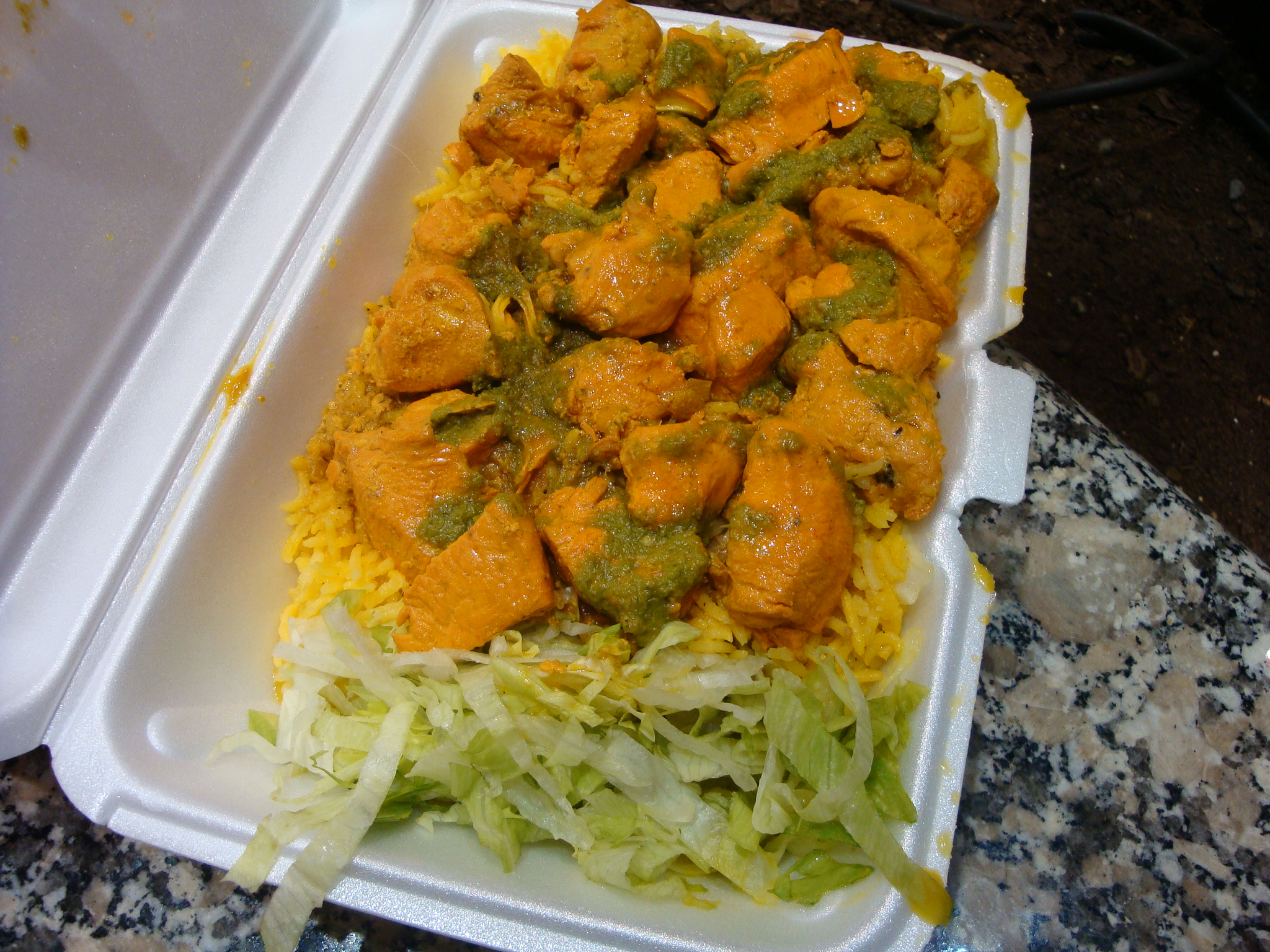 This time there wasn’t any actual curry sauce poured over the chicken and instead it was a reddish orange color from some sort of spice, and that would have been fine except this was all white meat and a little dry. Thank god for the cilantro sauce! There was some sort of thin yellow curry sauce in there too. How do I know? Because it all spilled out during my five minute walk into the plastic bag the container was in.