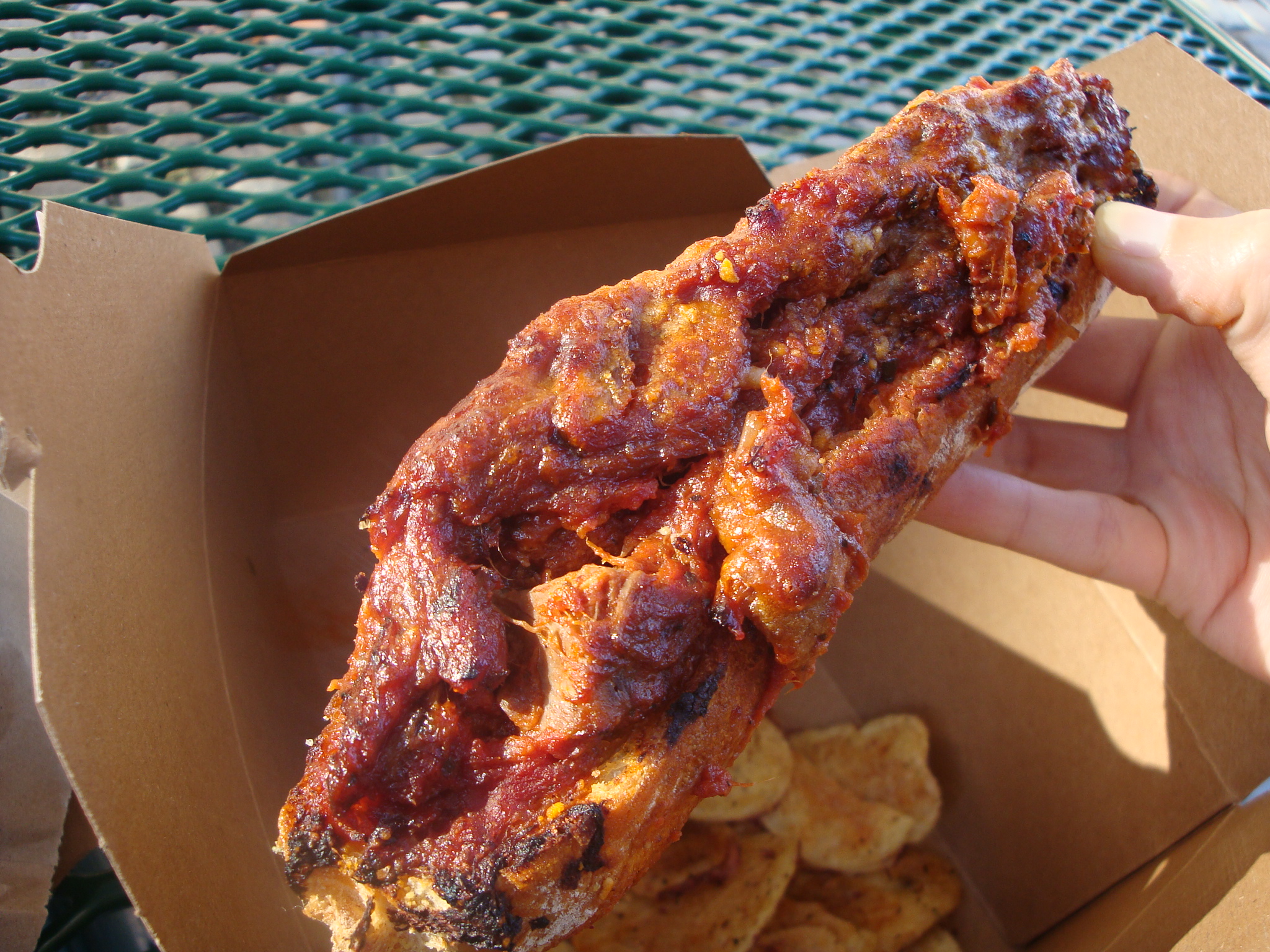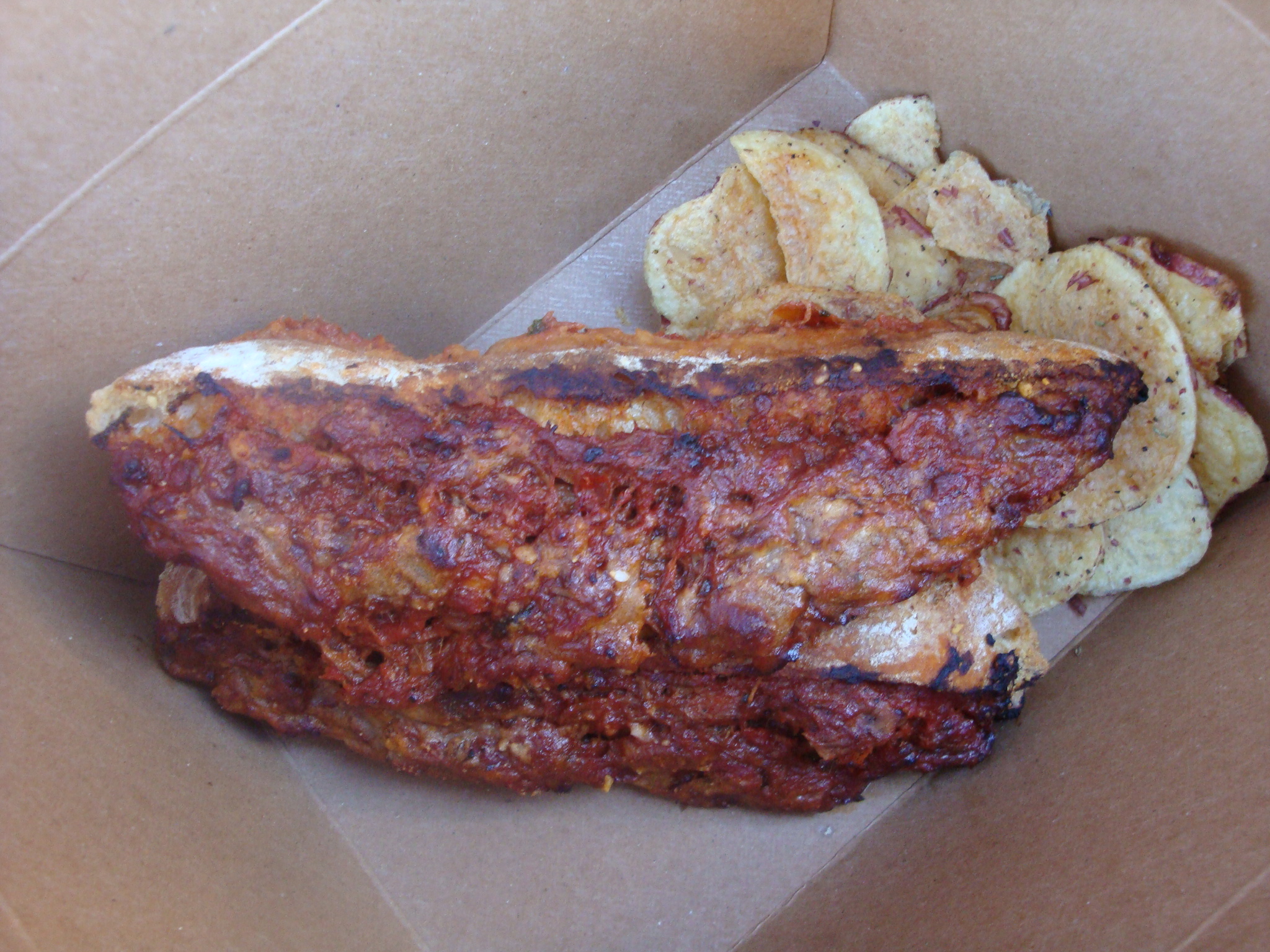 My food ($7.95) was ready after waiting a few minutes and I walked a couple of blocks before opening the box. What I found inside was a little scary looking. From afar my lunch looked like two giant ribs or something.