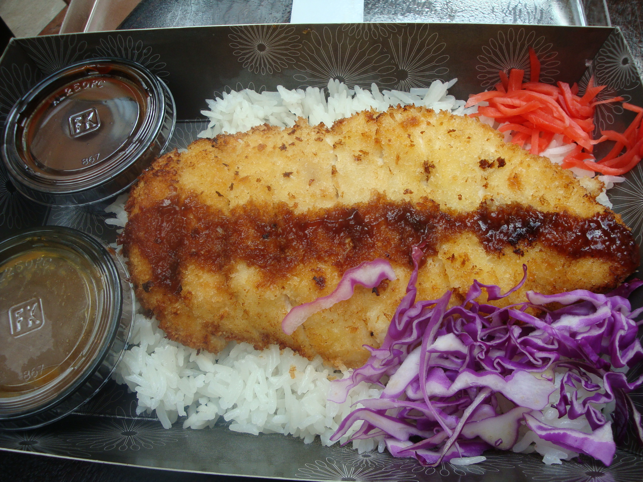 The chicken breast fillet was pale after its ride in the oven and had some tonkatsu sauce drizzled over. There was some more sauce on the side along with a tiny cup of curry. Now, the curry was good and all but I needed a bit more of it because without its customary oil bath the katsu was a little on the dry side.