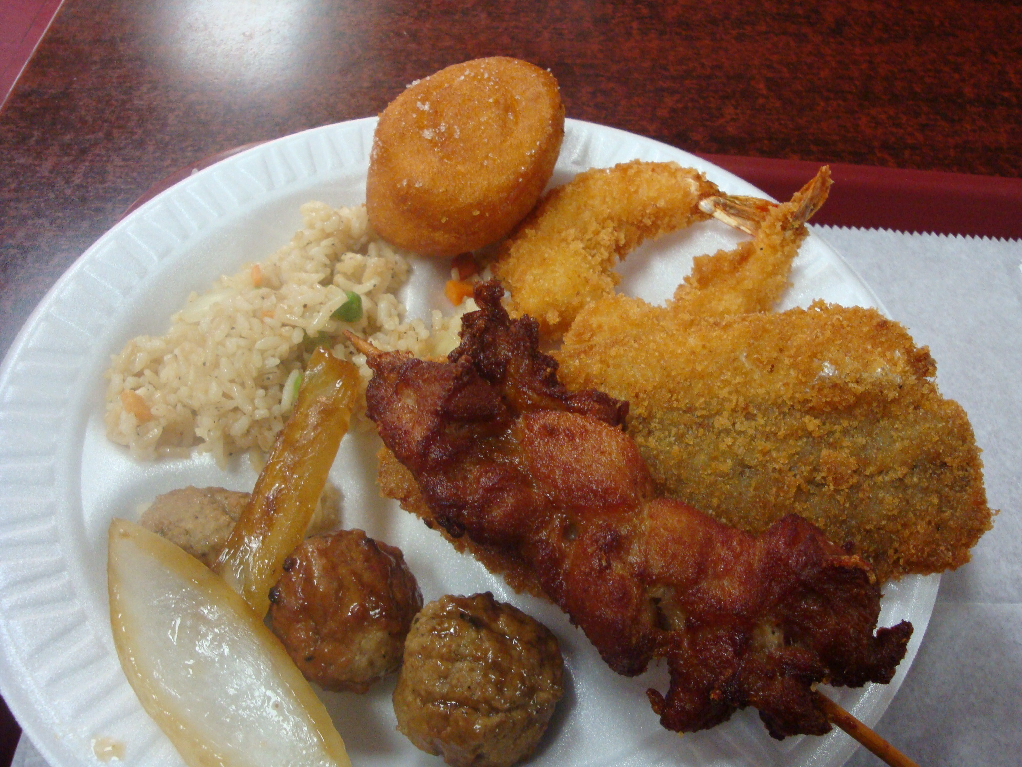 The other day I told a couple of people that my lunch destination was Sea World on Church St. (at Lispenard) to further investigate the $6.99 buffet that popped up. They wished me luck in the way that people do when you tell them you’re taking the subway to the Bronx or going to eat a McRib. My stomach has handled worse things than fried seafood, I thought, and it’s only come back to haunt me once! When I got there and asked if the buffet was by the pound, I heard the magical words “No, it’s all you can eat.” And with that I was handed my plate and went over to see what my strategy would be for gorging on fried foods.