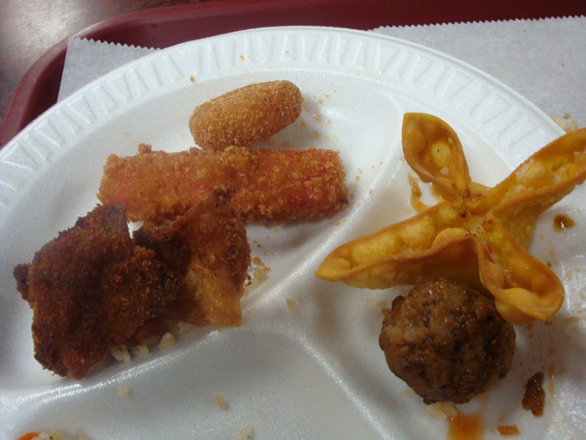 My random second plate included crab rangoon that I didn’t really care for (but was freshly fried), a fake crab stick, fish nugget and a big old chunk of what I think was breaded and fried pork. I would not recommend the crab sticks or fish nuggets unless you appreciate really low-grade seafood products. Oh, and I got another meatball (and later, a chicken stick) because these were the stars of the buffet for me.