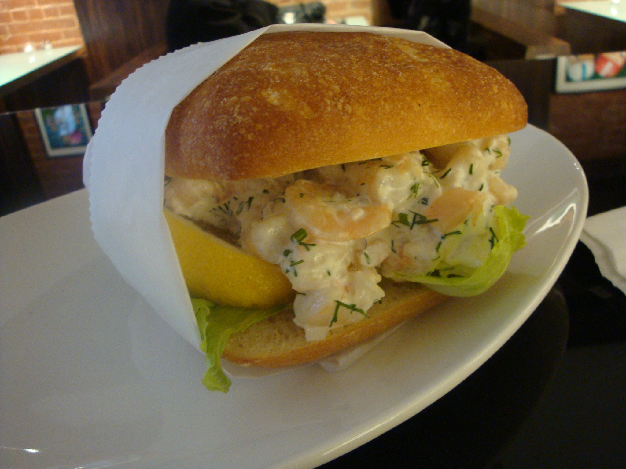 The sandwich isn’t massive, but it’s also not small. What I’m trying to say is it will fill up most stomachs unless you’re really hungry. It’s a pretty simple shrimp salad with some dill and lettuce tucked in there.