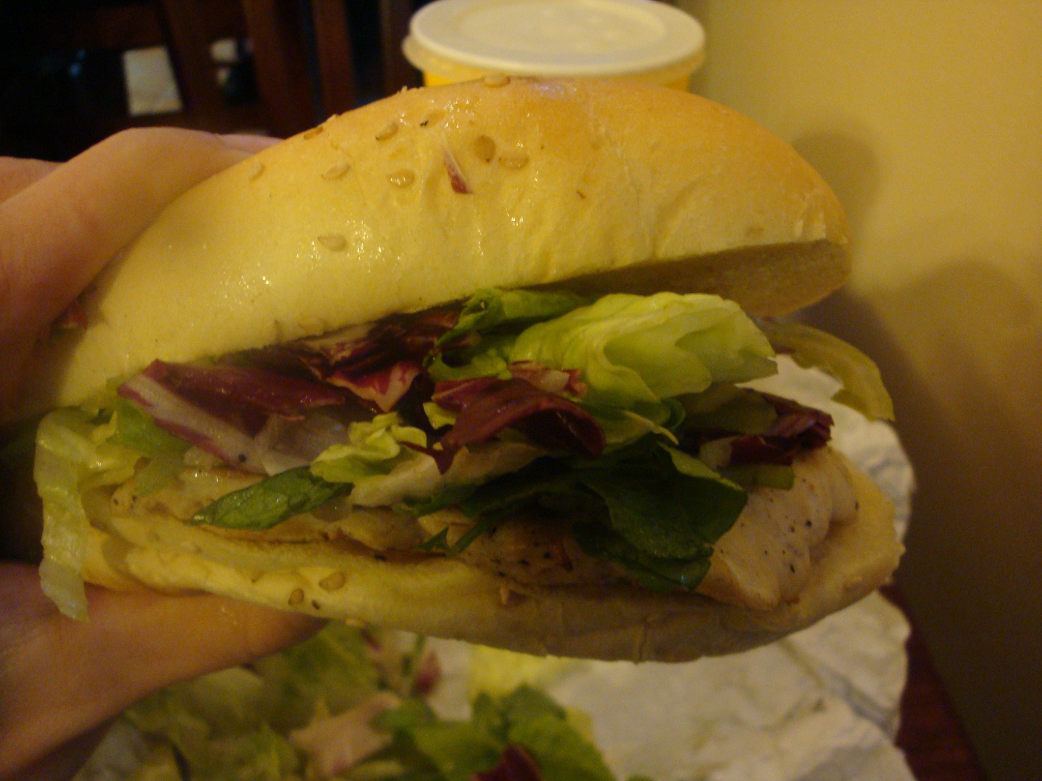 You can kind of see it in this picture that there was a crapload of lettuce on this sandwich. Yep, it was a lettuce and grilled chicken sandwich. Just lettuce and chicken. I wanted some sort of sauce on it, but there was none, not even on the side. What confuses me about this is that the lettuce and chicken sandwich had more calories listed than the chicken and cheese sandwich below it. I will have to agree with Zach that this grilled chicken was top notch in that it didn’t taste like it was assembled from several different birds.